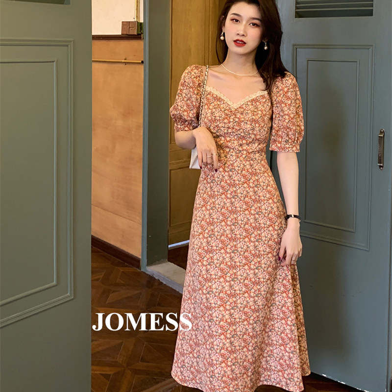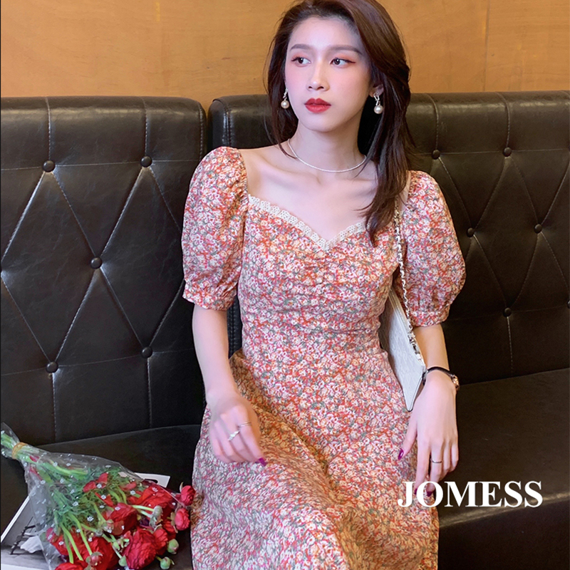Y7991-图片色韩版复古时尚泡泡袖蕾丝领修腰中长款碎花连衣裙