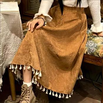 Y0582-(2色入内)原宿风复古格子高腰A字排扣假二件学院风日系短裙