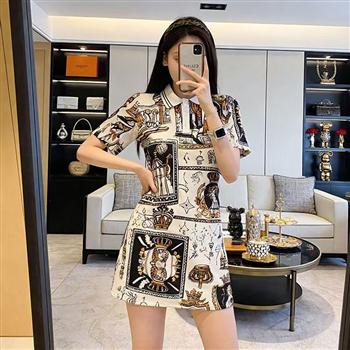 YF6980-图片色洋气个性漫画印花POLO领修身显瘦小个子设计感韩版连衣裙