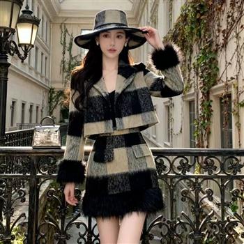 YF6274-图片色秋冬加厚西装领双排扣宽松大码学院风百搭短款毛呢外套上衣