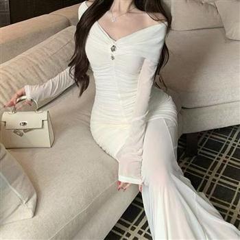 YF7042-(3色入内)名媛气质一字肩披肩感褶折钉珠弹力修腰包臀鱼尾网纱设计连衣裙