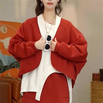 YF7046-(2色入内)两件套春秋新款长袖宽松披肩开衫搭蝴蝶结束胸弹力百褶上衣套装