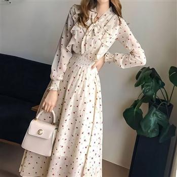 YF7044-图片色赫本风蝴蝶结松紧腰显瘦碎花印花小众长袖春装新款雪纺连衣裙