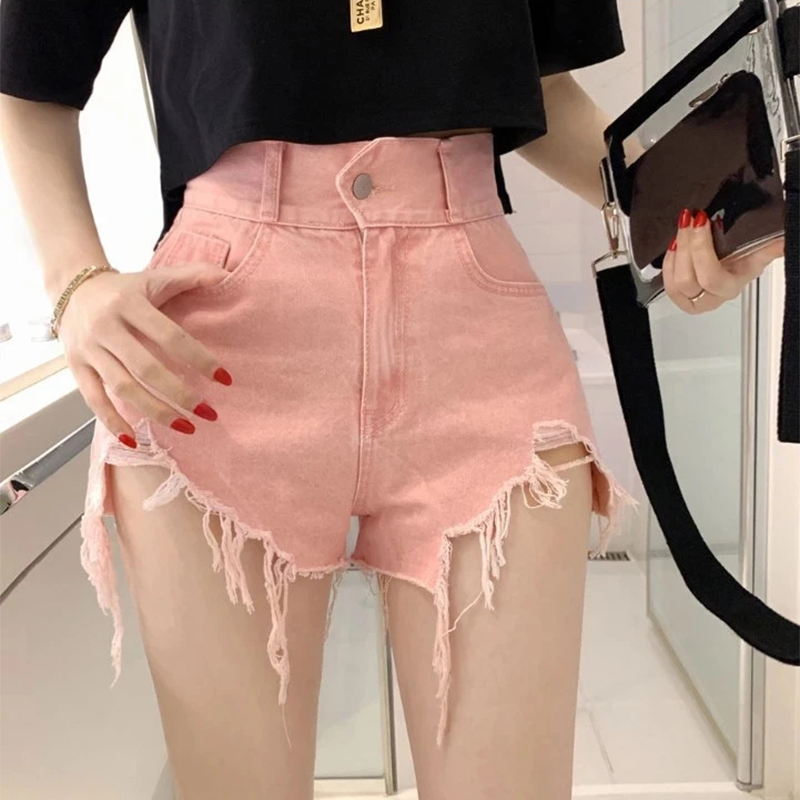 YF0531-图片色时尚高腰包臀流苏粉嫩色设计感破洞韩版牛仔裤 性感热裤