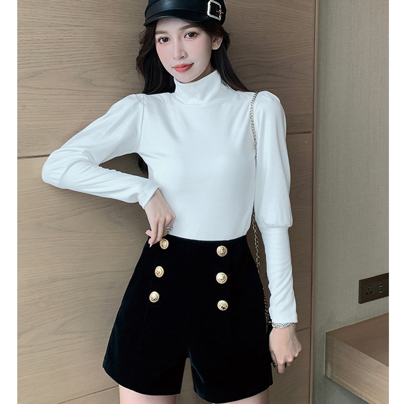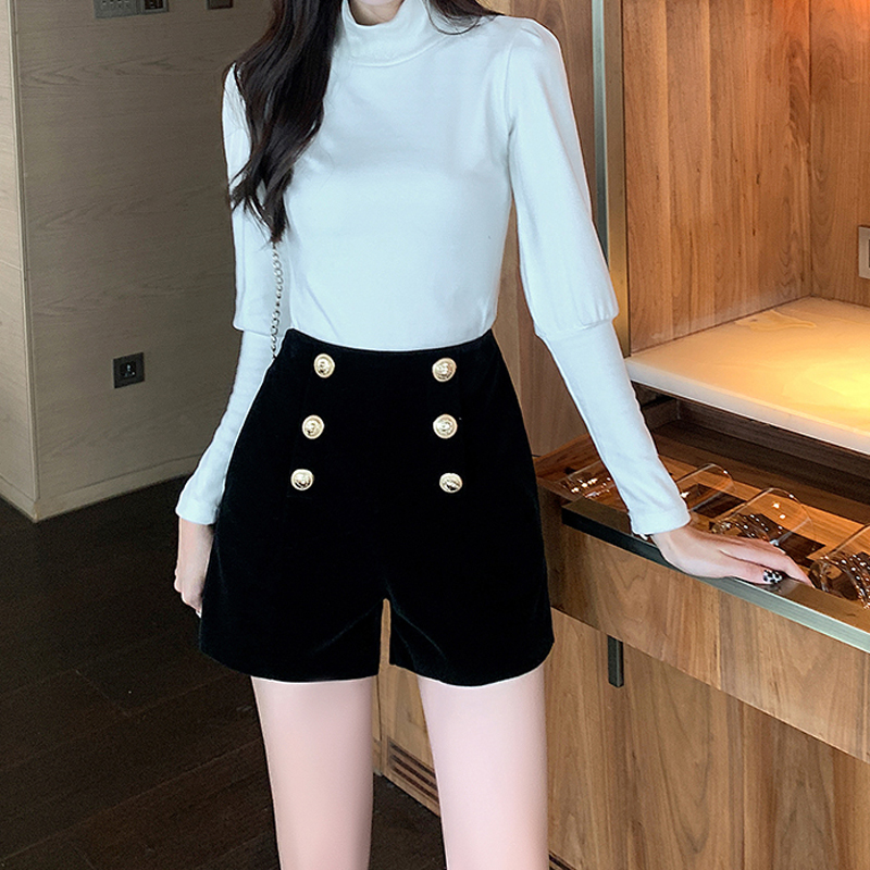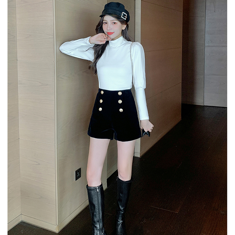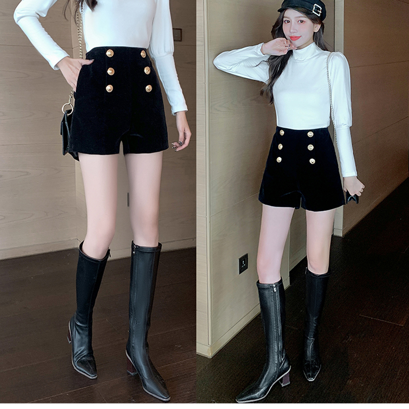 YF2049-图片色秋冬新款双排扣高腰A字小个子显高辣妹装金丝绒保暖短裤