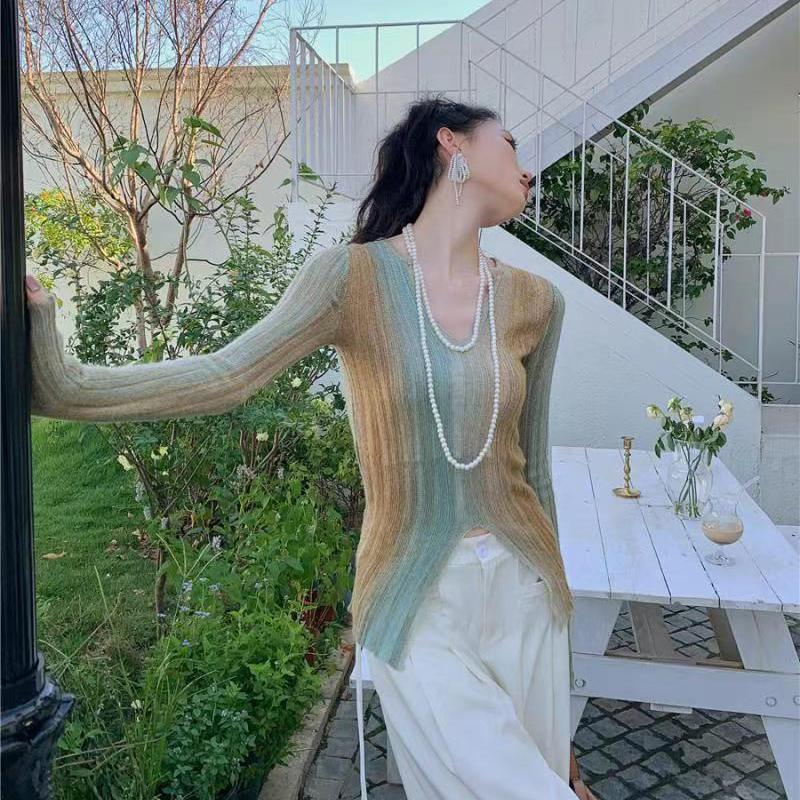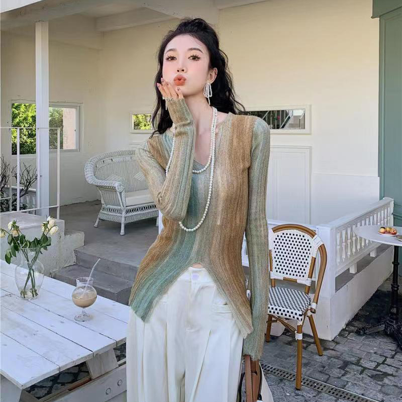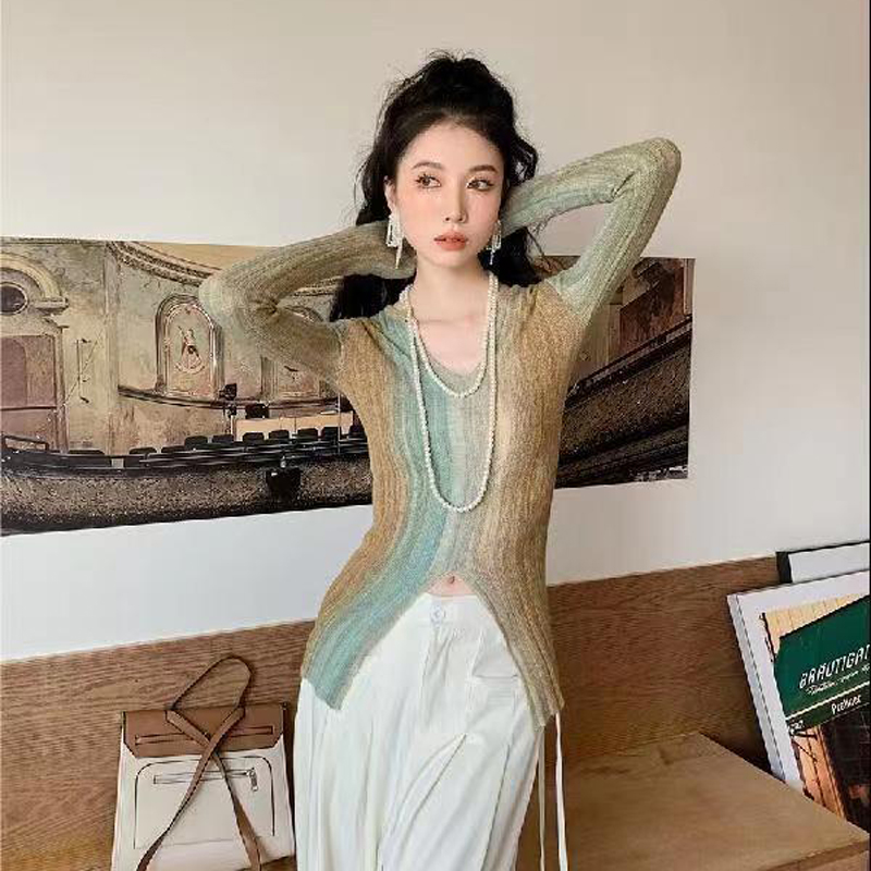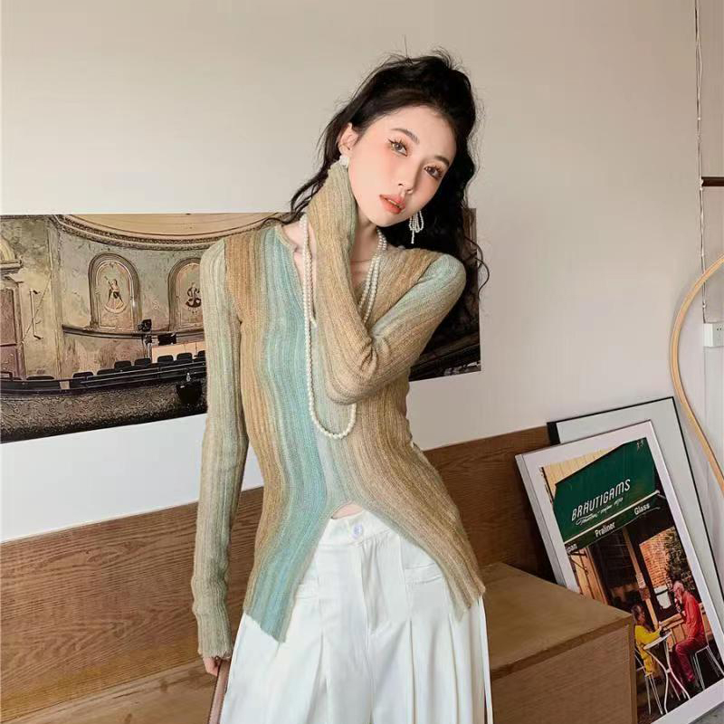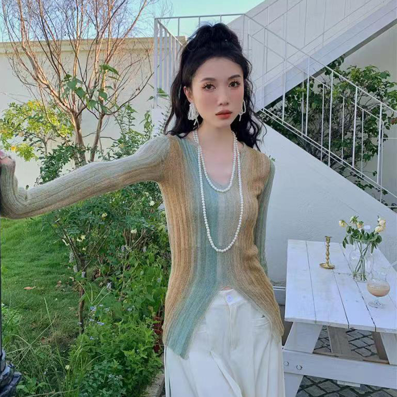 YF2199-图片色时尚小众设计感长袖竖条纹开叉镂空修身针织衫 洋气上衣