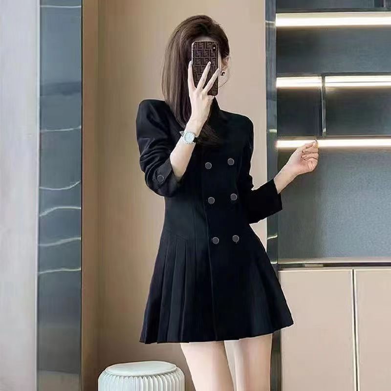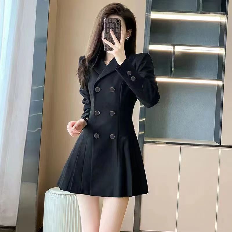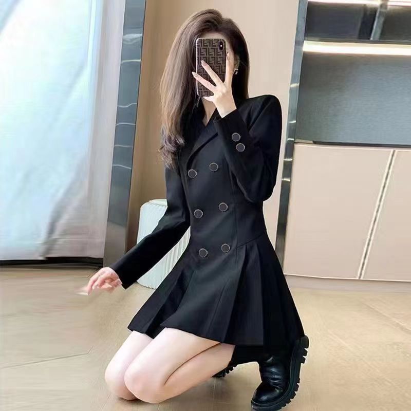 YF3764-图片色韩版赫本风双排扣褶折修腰长袖翻领黑色西装裙外套