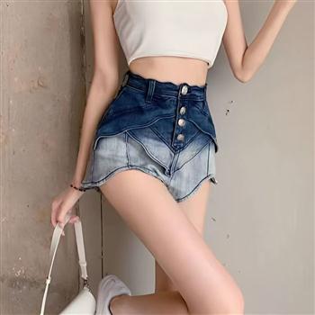 YF7130-图片色港式渐变排扣高腰茶叶边A字弧边设计感夏季新款牛仔短裤