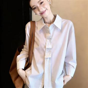 YF7131-(2色入内)韩版小众春夏新款小心机褶折感领带系扣长袖翻领休闲衬衫