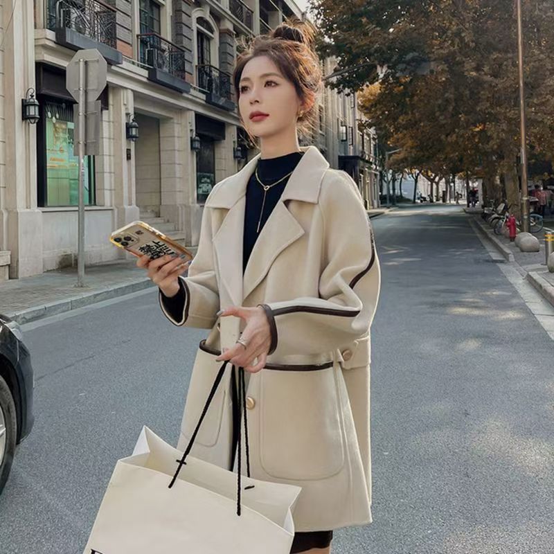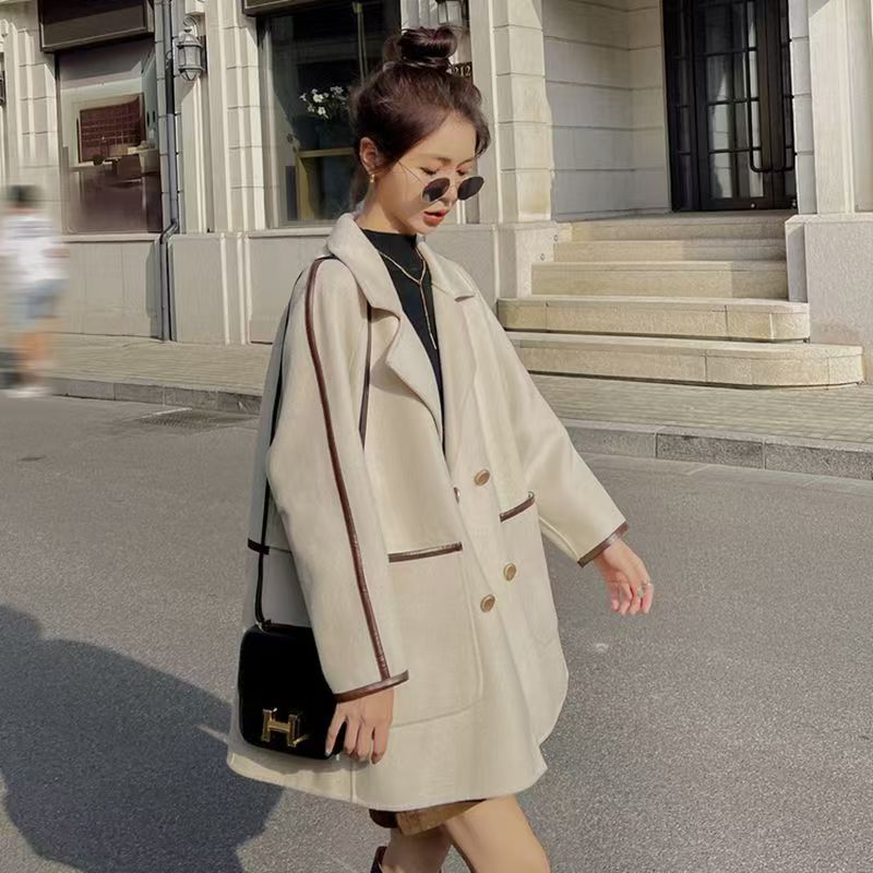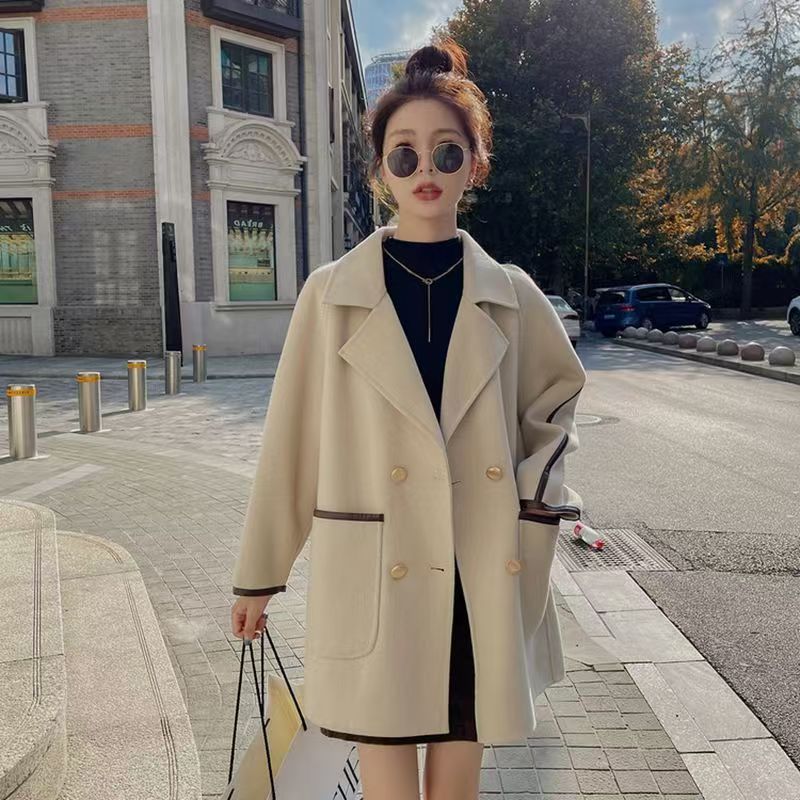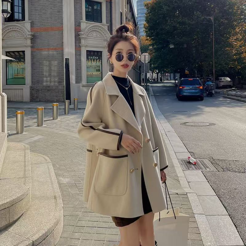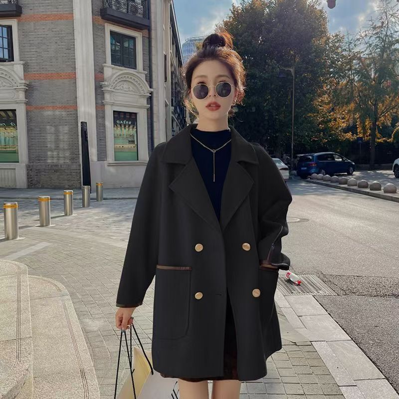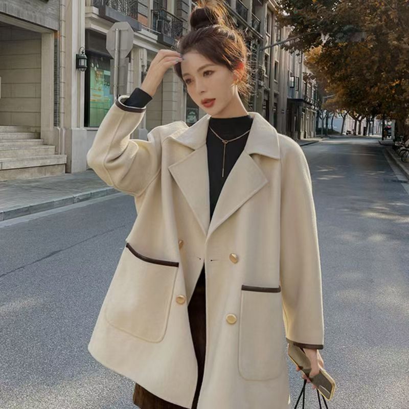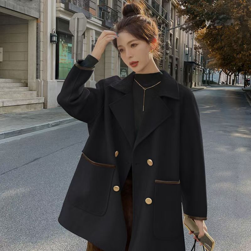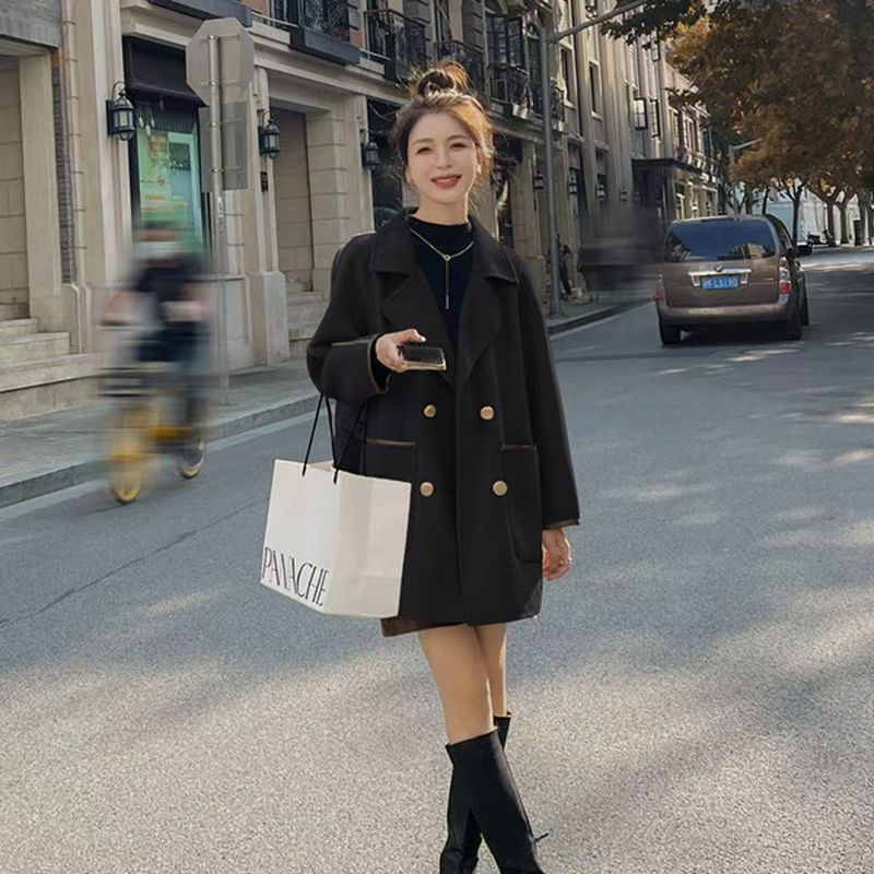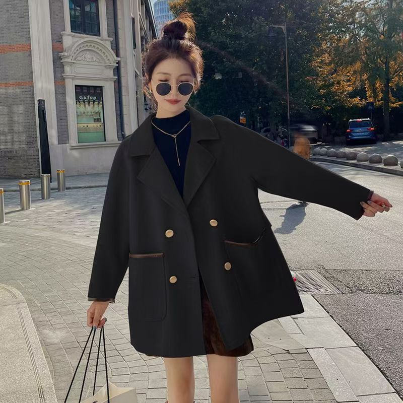 YF3929-(2色入内)韩版长袖连肩西装领双排扣赫本风大码毛呢外套 上衣