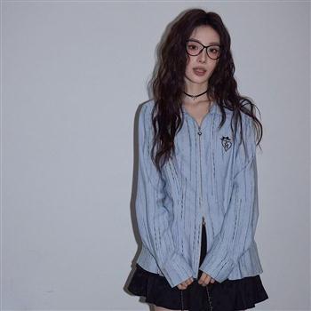 YF7405-图片色韩版字母刺绣个性暗条纹蓝色POLO领宽松大码休闲上衣