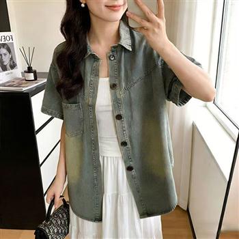 YF7408-图片色复古色做旧洗水短袖POLO领系扣薄款夏季休闲牛仔上衣