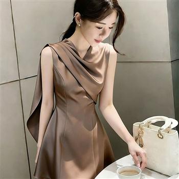 YF7449-(2色入内)时尚名媛气质无袖飘带修腰褶折感丝质高级感赫本风礼服裙子