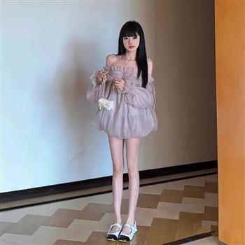 YF7450-图片色小香风泡泡袖荷叶边一字肩宽松大码性感夏季新款雪纺上衣