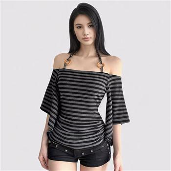 YF7456-图片色纯欲风一字肩弹力修腰条纹显瘦五分袖夏季韩版新款上衣