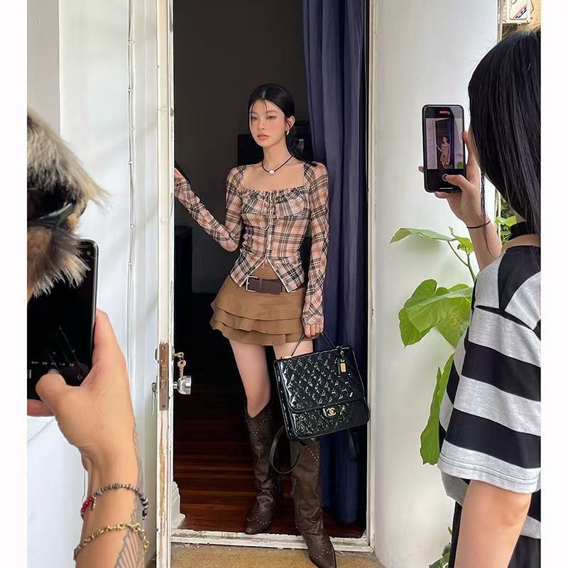YF4154-图片色春装新款方领绑绳褶折开叉显瘦长袖格子衫 别致小众上衣