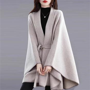 YF6474-图片色冬季时尚名媛气质蝙蝠袖系腰带宽松大码新款斗篷披肩外套
