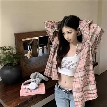YF6475-图片韩版慵懒风复古格子大码春秋百搭长袖翻领粉色小清新衬衣新款