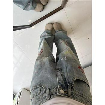 YF6150-图片色时尚卡通刺绣可爱猫猫系扣高腰复古洗水直筒坠地感牛仔裤