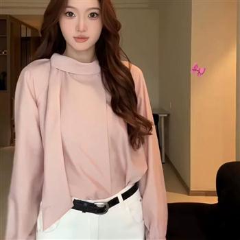 YF6153-(2色入内)甜美时尚后背系扣设计围脖飘带小众宽松大码别致雪纺衫