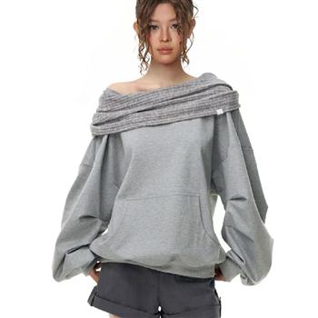 YF6154-图片色慵懒风长袖连帽两穿设计宽松大码一字肩个性美式卫衣
