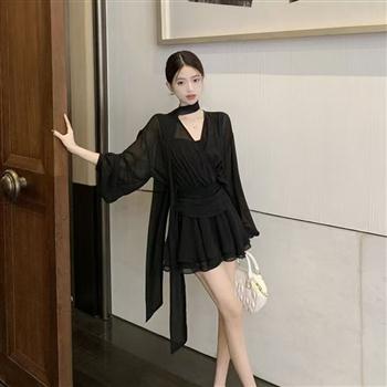 YF6151-图片色两件装韩版长袖翻领系扣宽松黑色衬衣配绑带收腰包臀套装新款