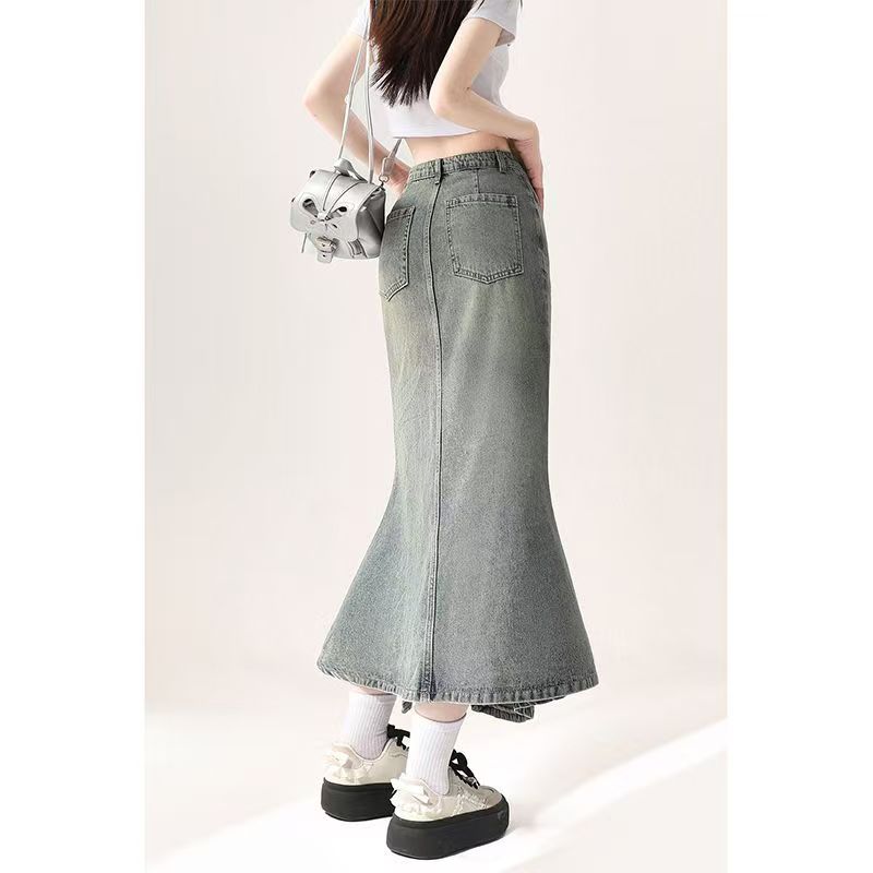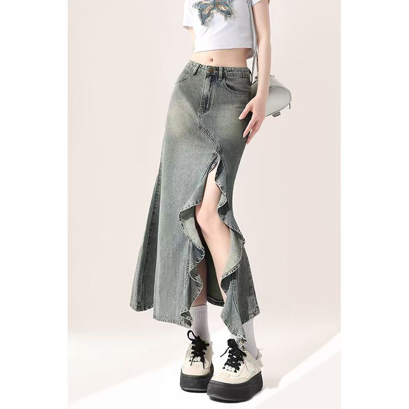 YF4387-图片色港式系扣高腰不规则荷叶边开叉设计洗水复古牛仔裙