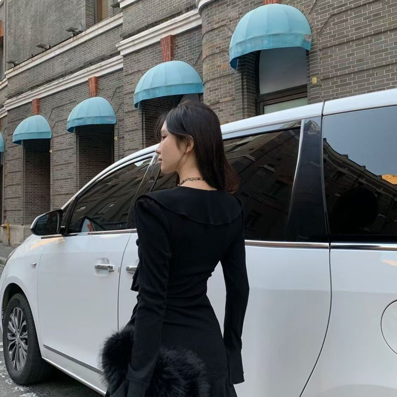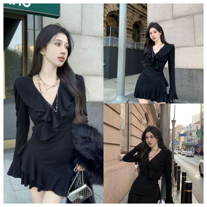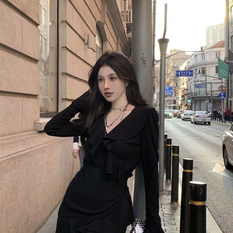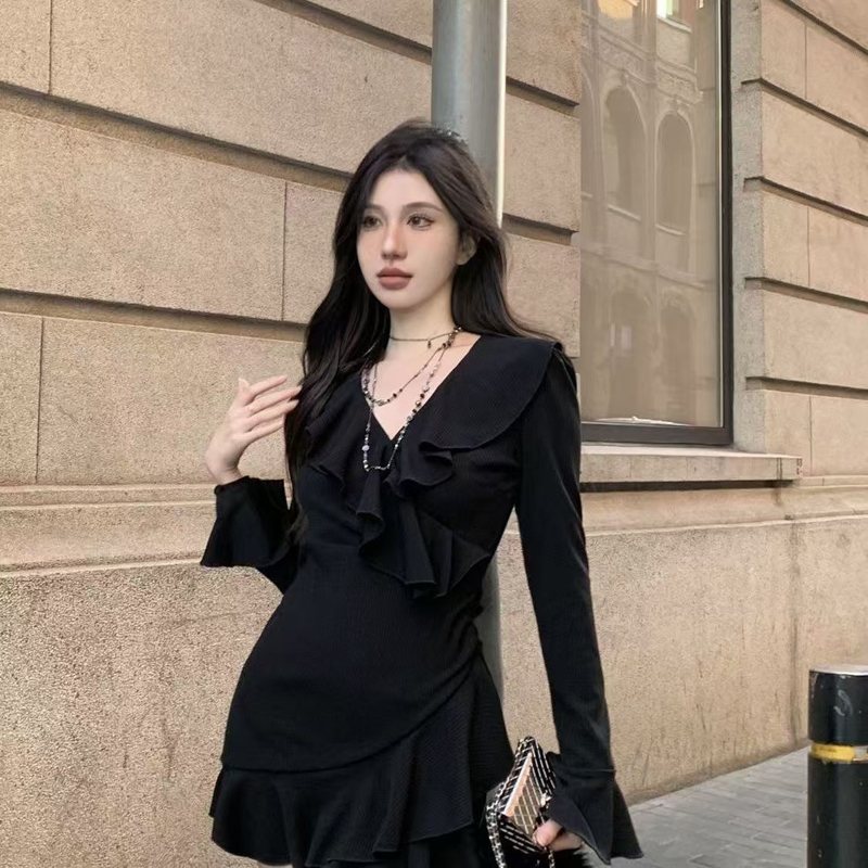 YF4498-图片色春秋新款V领套头微喇叭长袖荷叶边下摆欲女风气质连衣裙