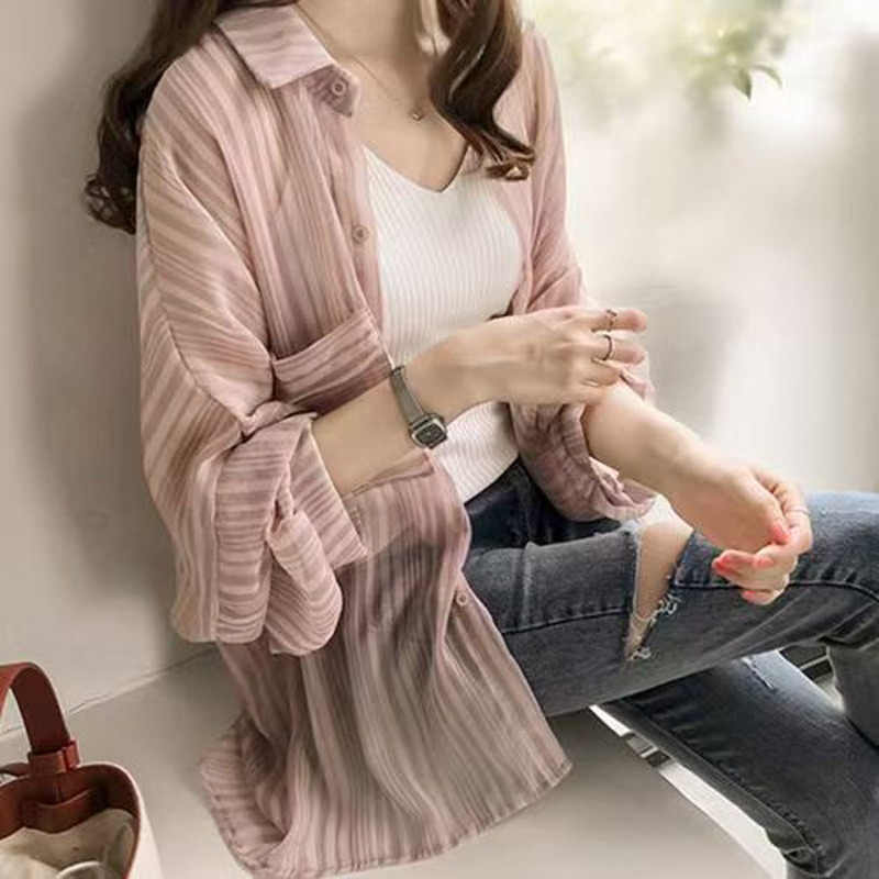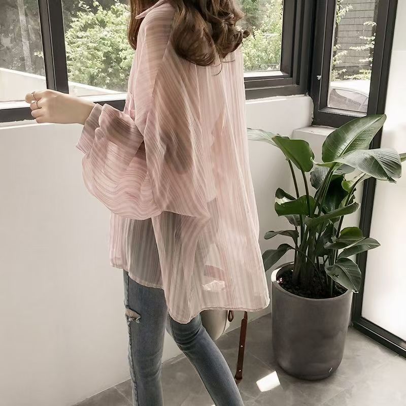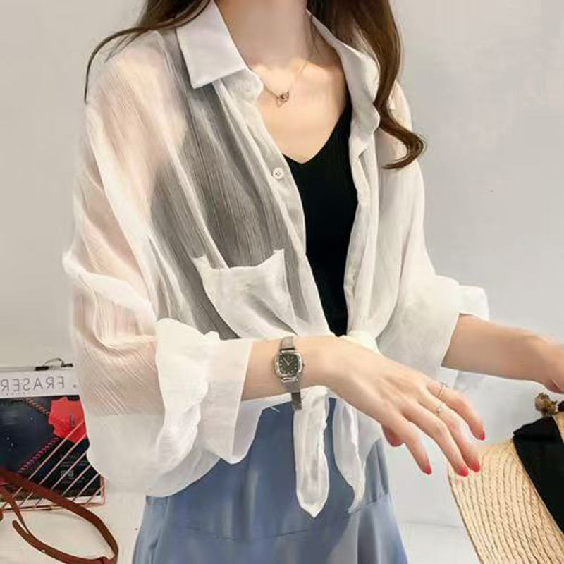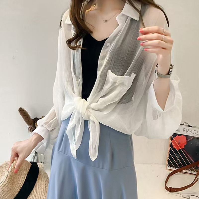 YF4620-(3色入内)夏季透视装薄款长袖翻领慵懒风加大码飘逸感雪纺衫