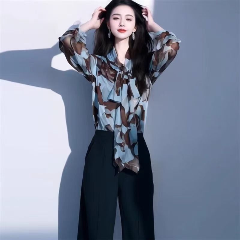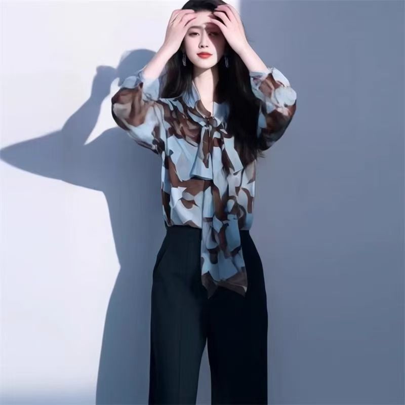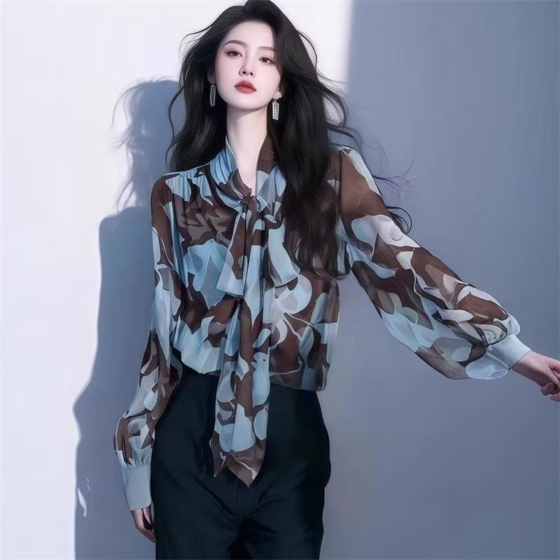 YF4823-图片色蓝色碎花印花个性精品灯笼袖蝴蝶结领带大码雪纺衫