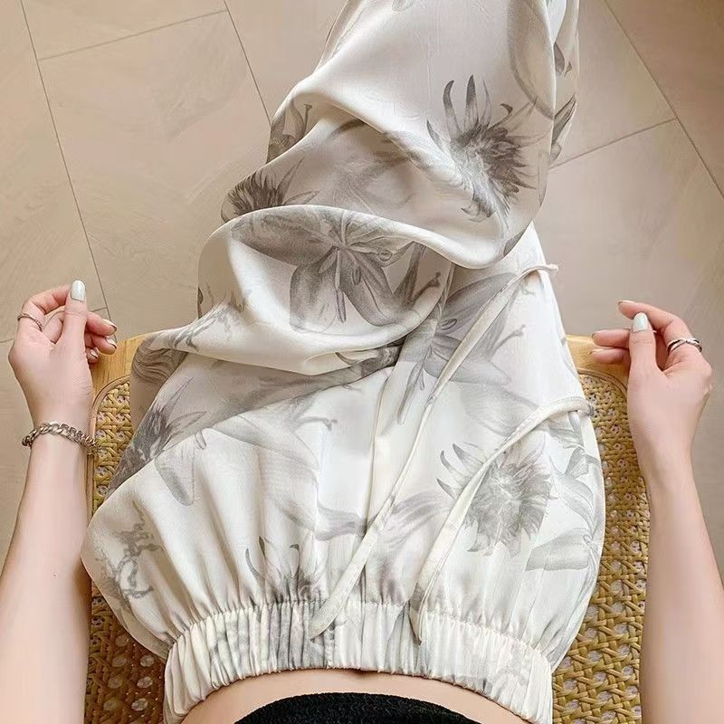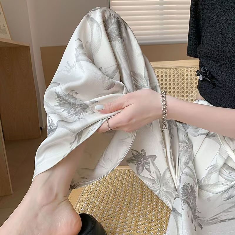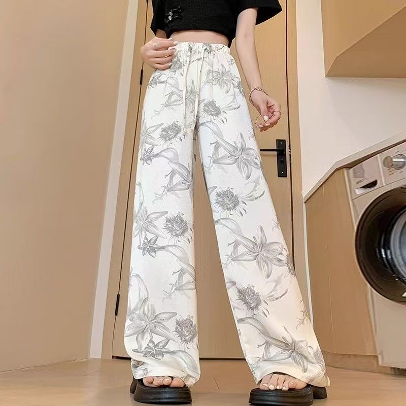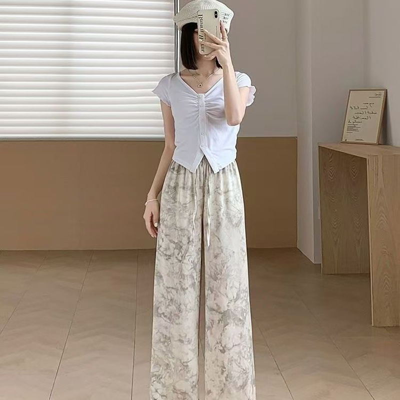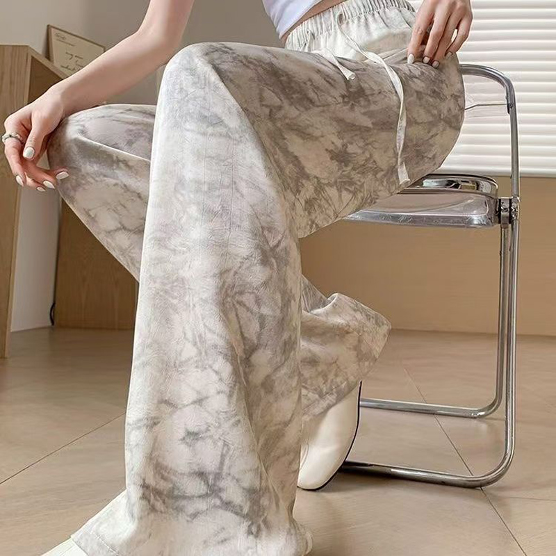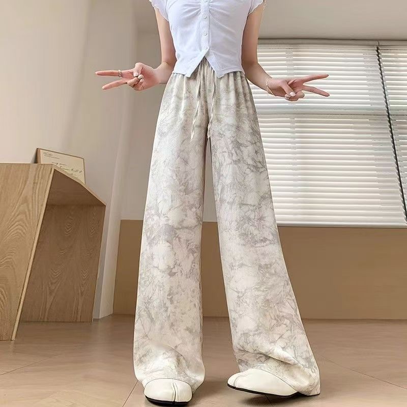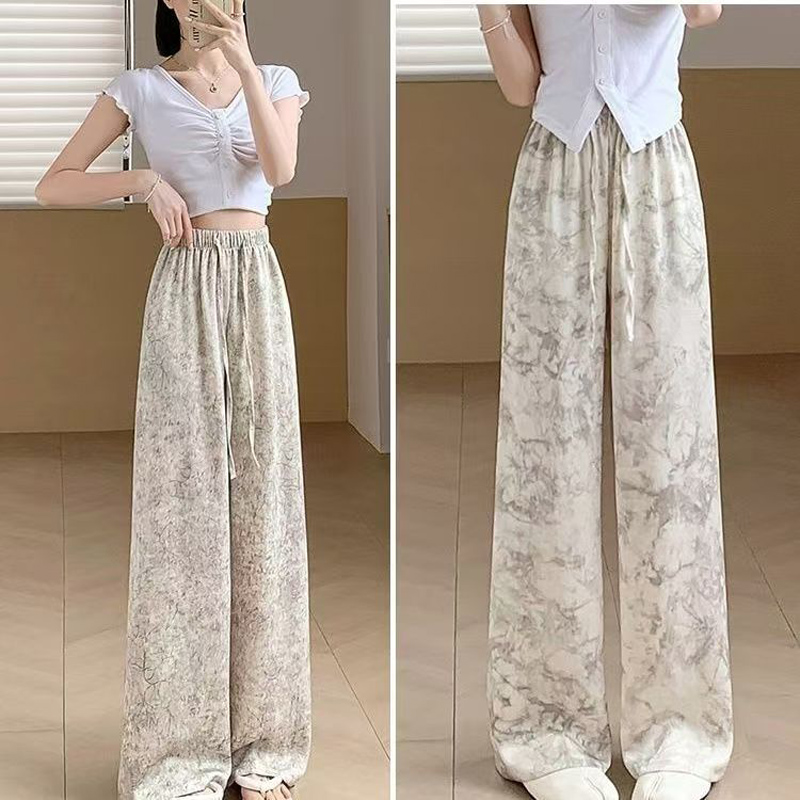 YF5160-(2色入内)水墨印花直筒坠地感褶折松紧腰绑绳坠地感冰丝舒适长裤