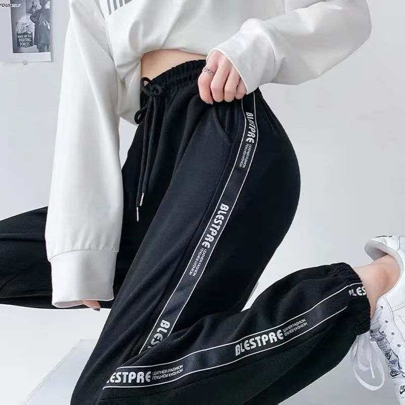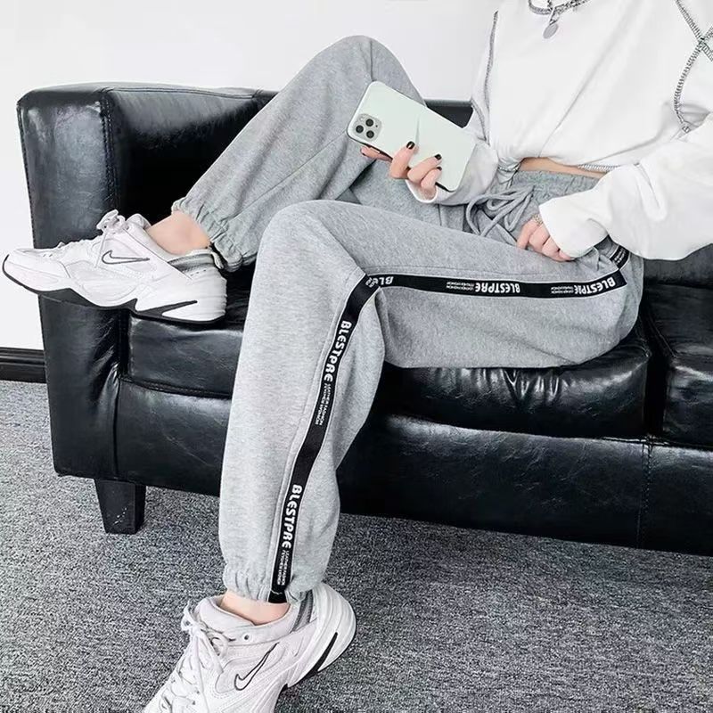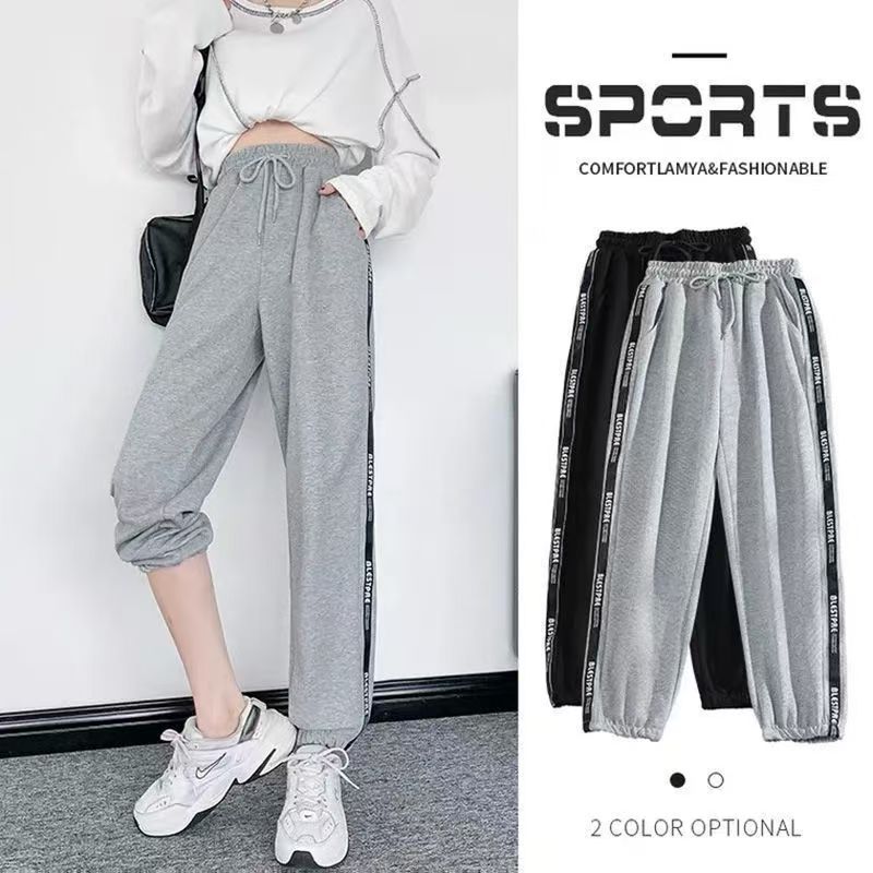 YF5189-(2色入内)侧条纹字母边松紧腰绑绳束腿薄款运动休闲卫衣裤
