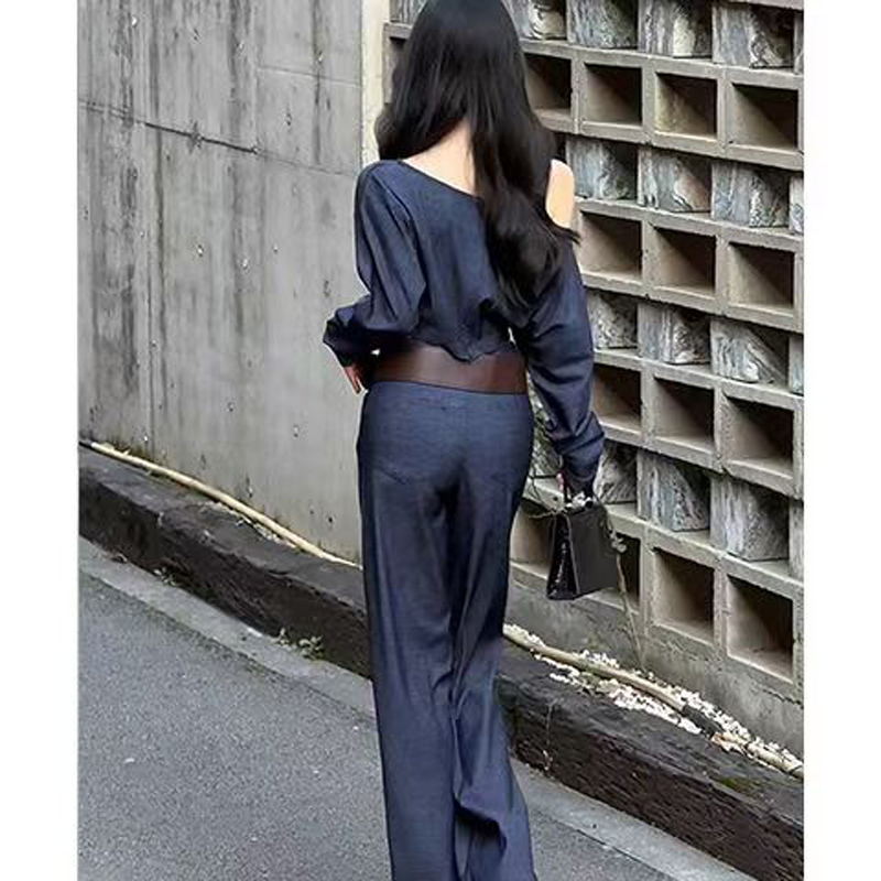 YF5573-图片色时尚新款高腰系扣直筒坠地感拖地大码阔腿复古牛仔裤