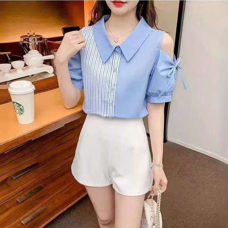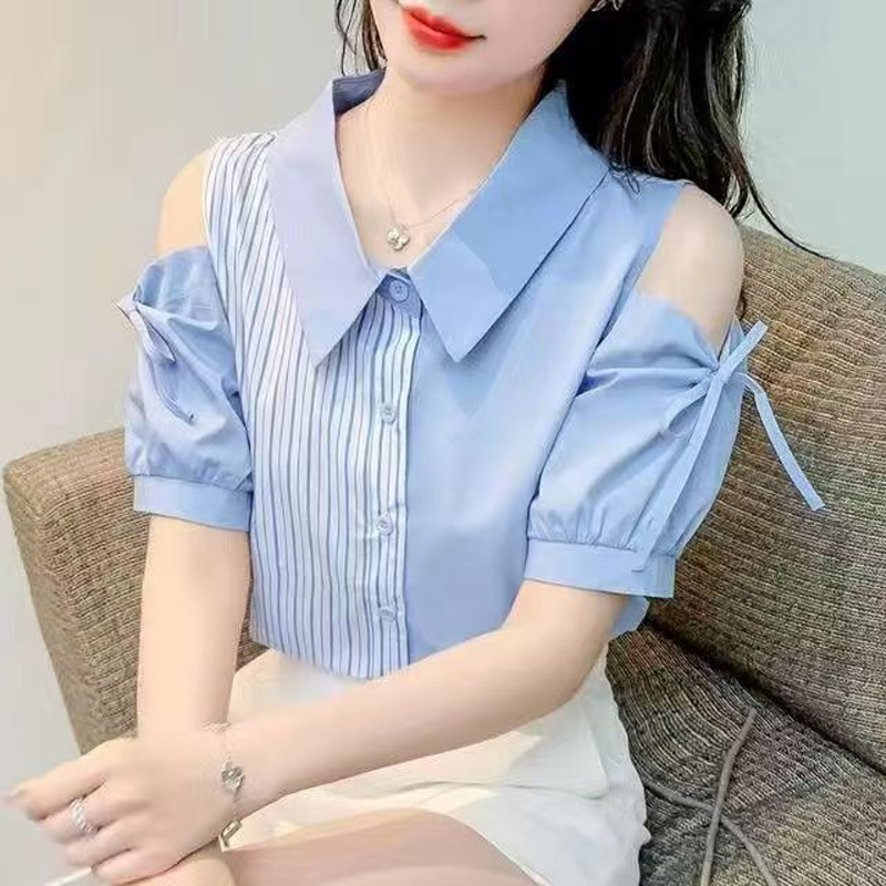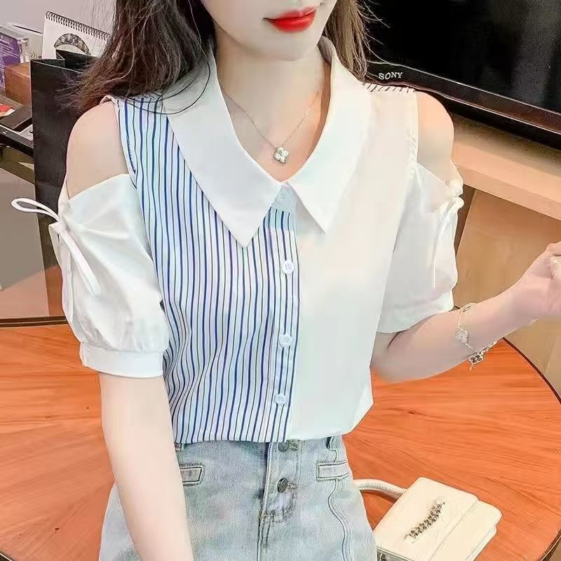YF5632-(2色入内)甜美小心机镂空系蝴蝶结撞色条纹设计感宽松POLO领气质上衣