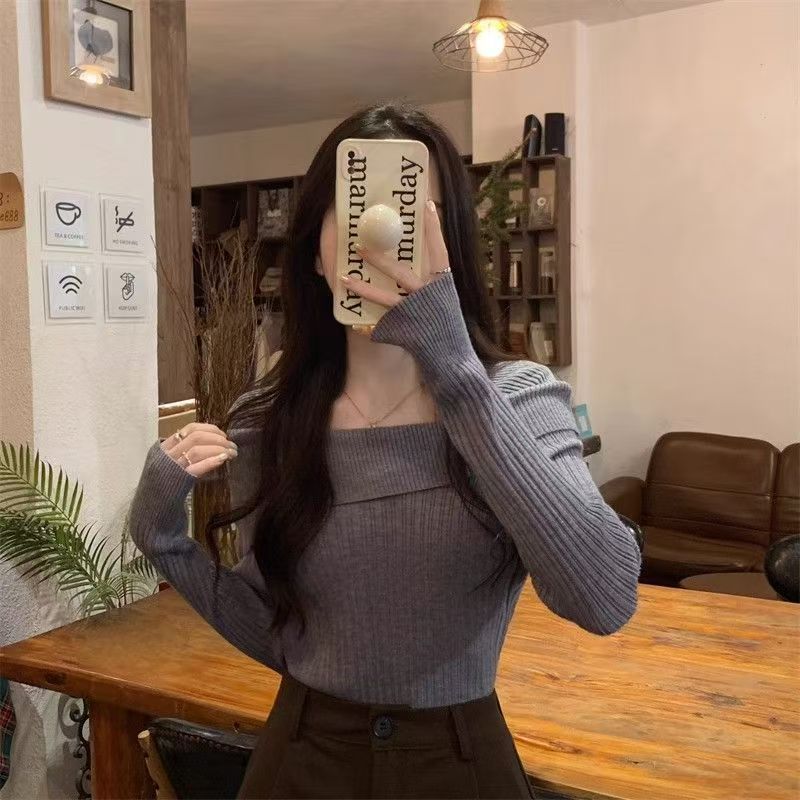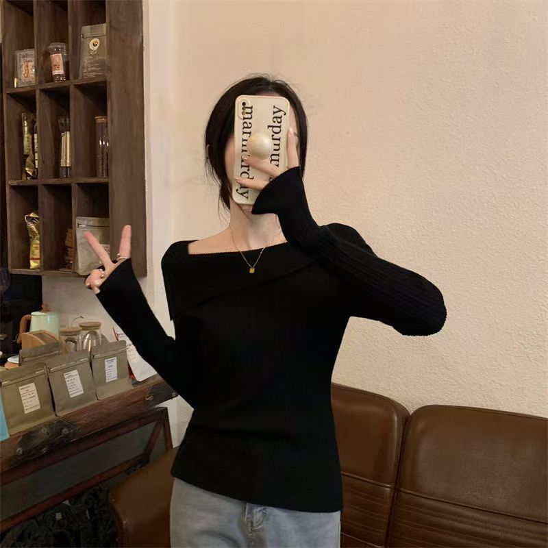 YF5691-(5色入内)秋冬一字肩不规则叠领收腰显瘦长袖针织性感百搭针织上衣