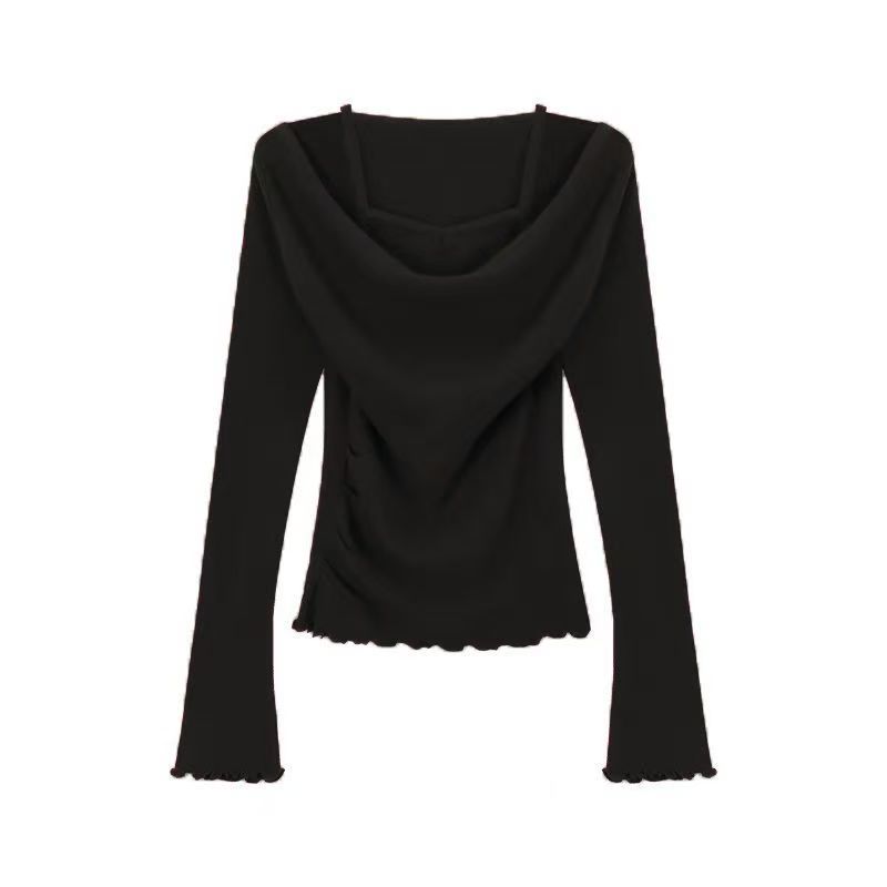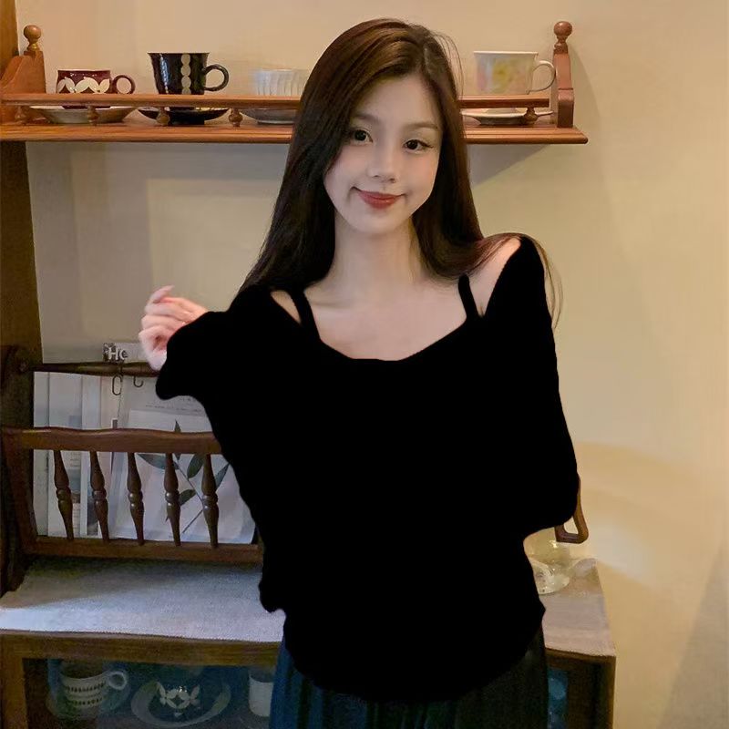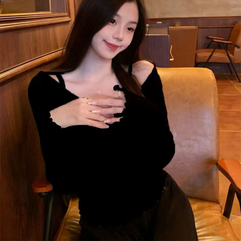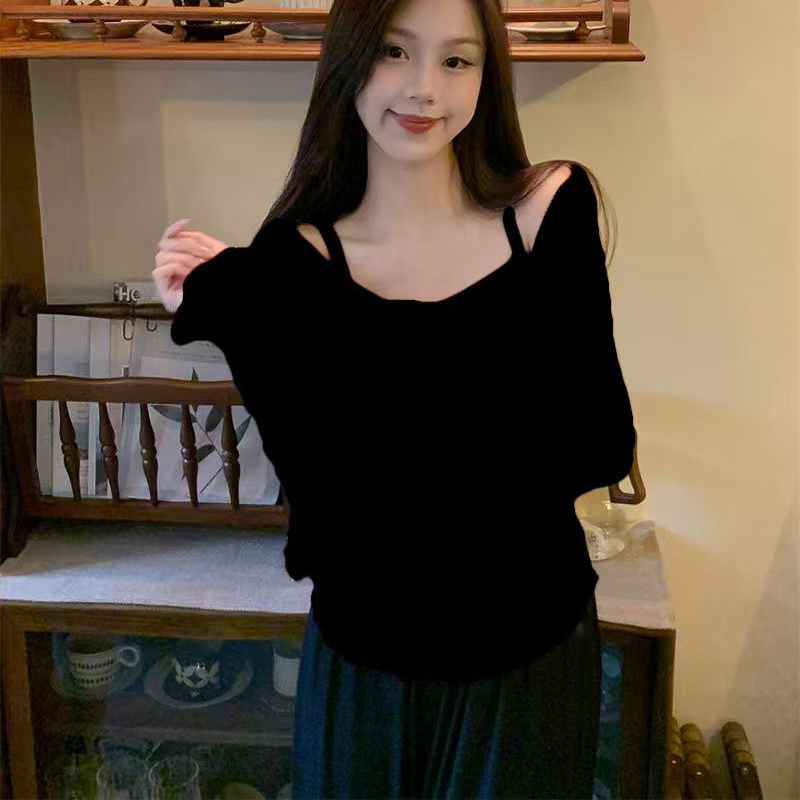 YF5695-(3色入内)秋冬一字肩长袖套头弹力收腰假两件针织ins气质针织上衣