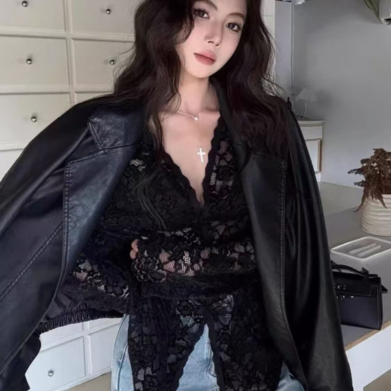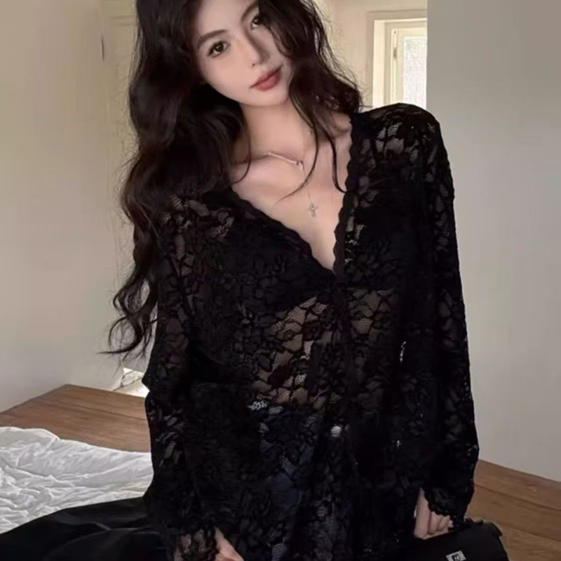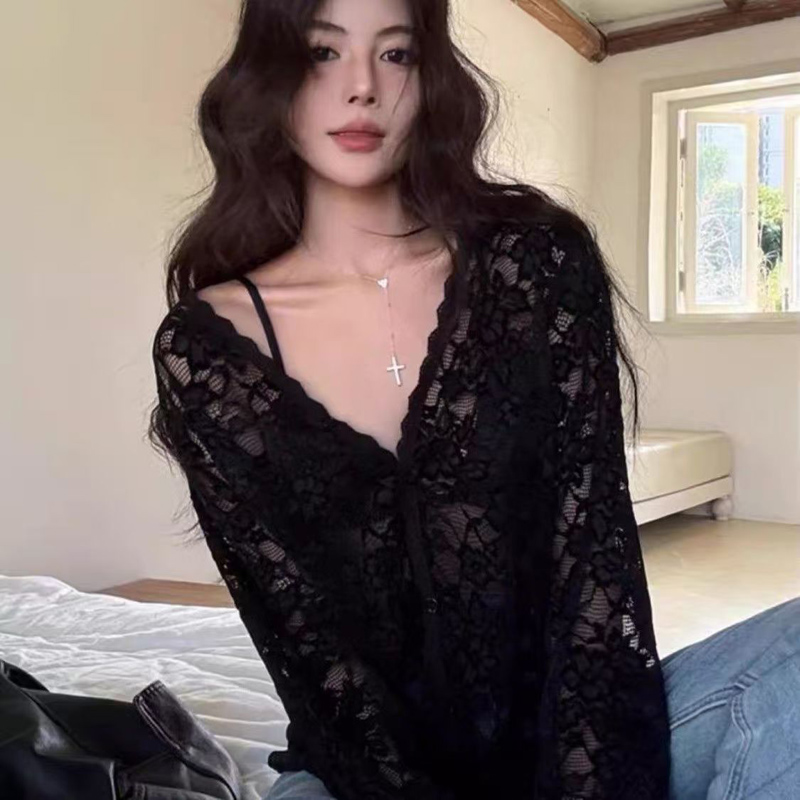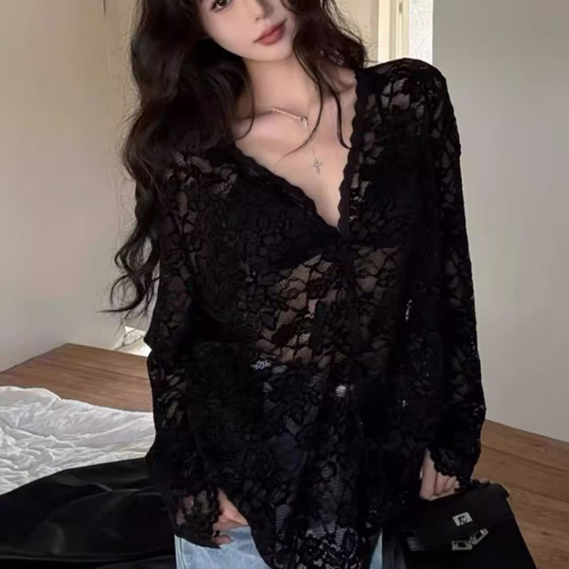 YF5702-(2色入内)早秋慵懒风镂空长袖V领系扣宽松大码辣妹性感蕾丝上衣