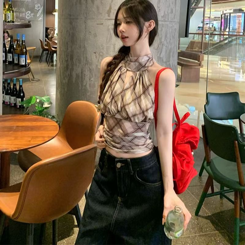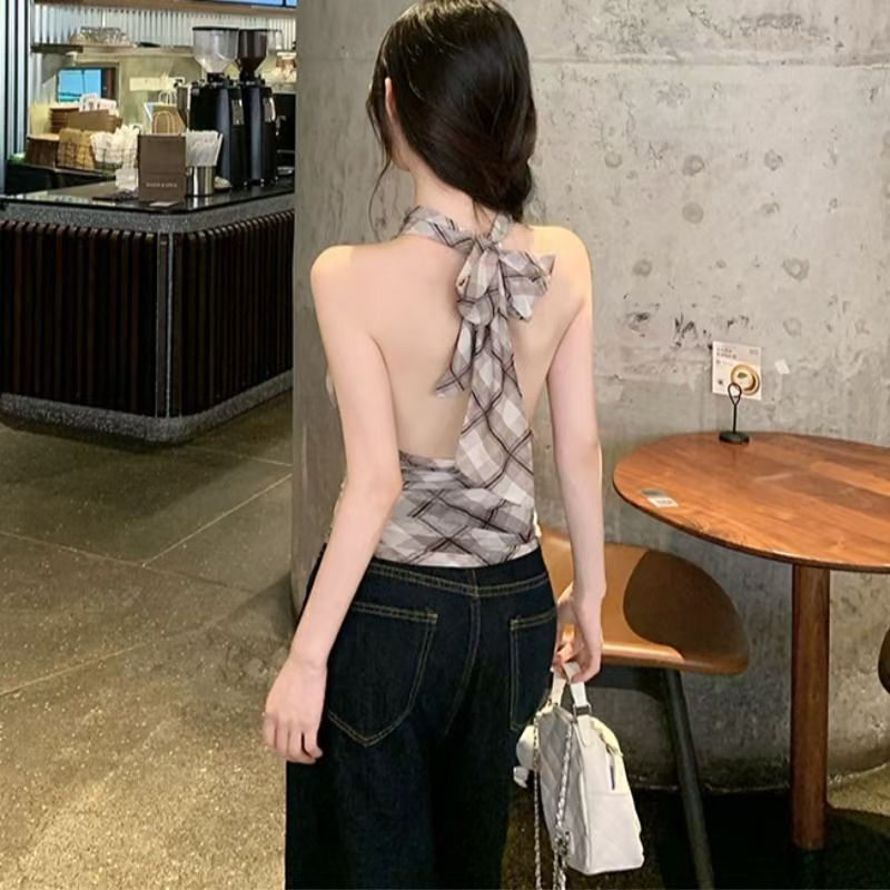YF5707-图片色性感时尚无袖围脖后背系蝴蝶结露背复古格子印花潮上衣