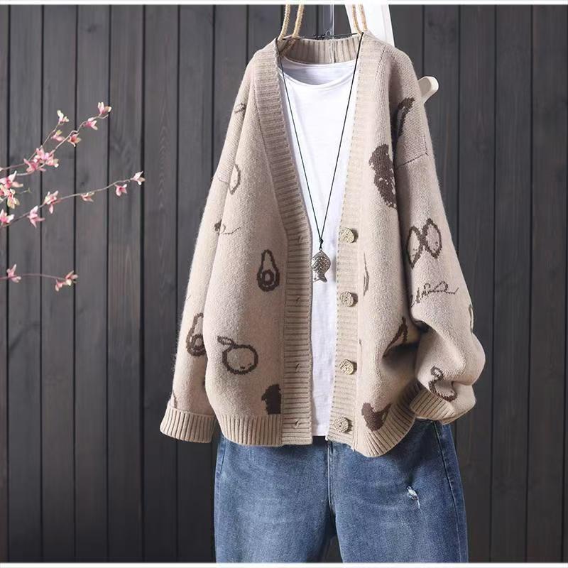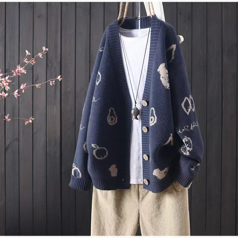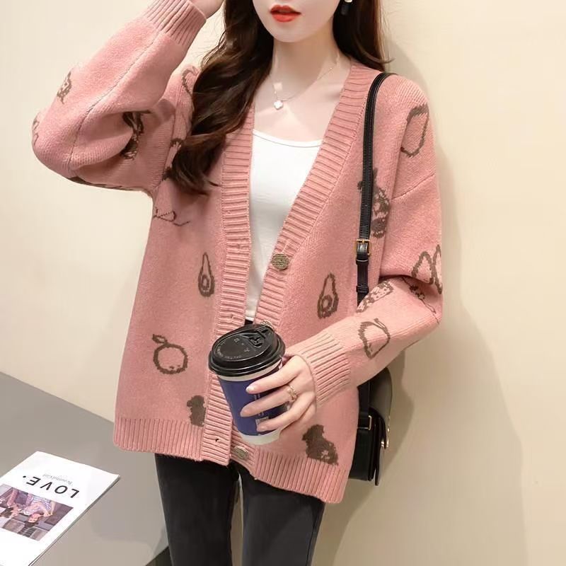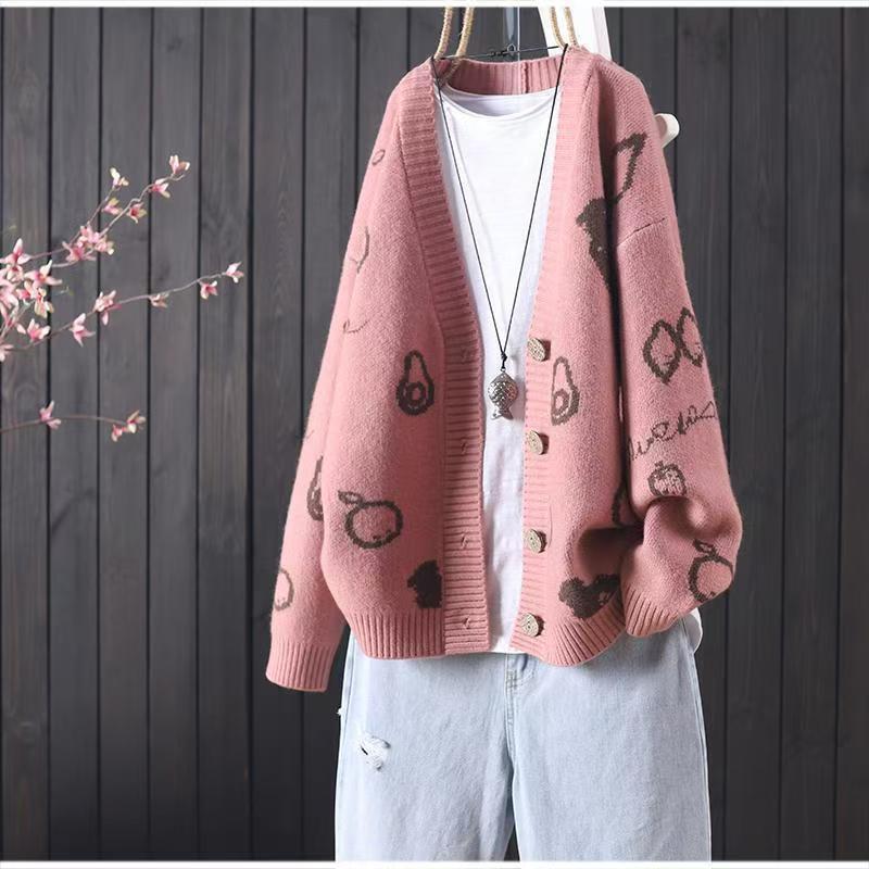 YF5717-(4色入内)冬季新款水果刺绣长袖开衫排扣加厚大码慵懒风针织外套