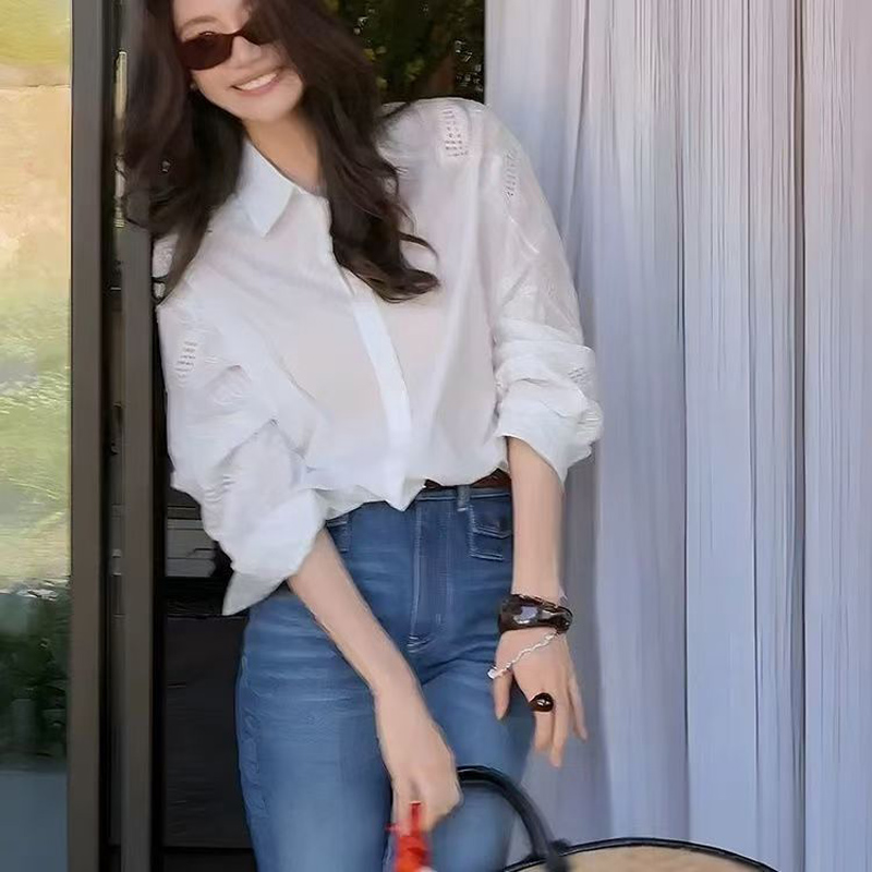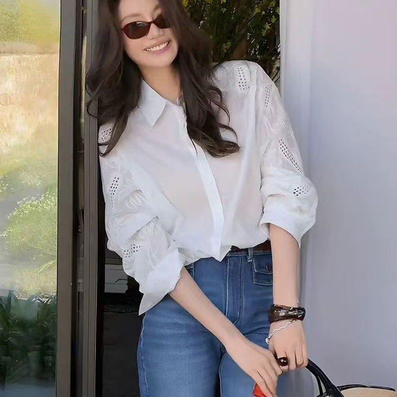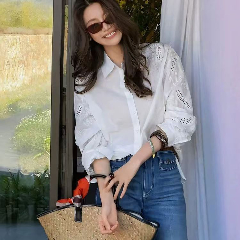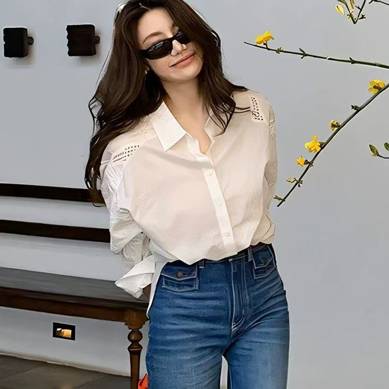 YF5748-图片色高端OL通勤镂空长袖翻领系扣白色精致设计感大码上衣