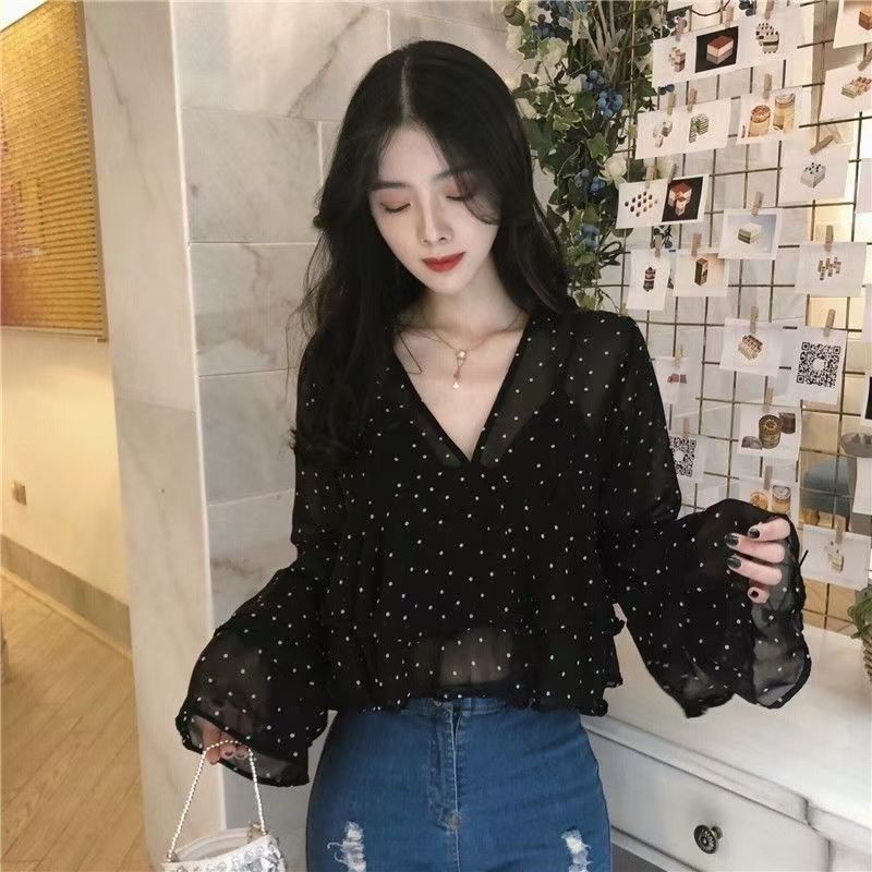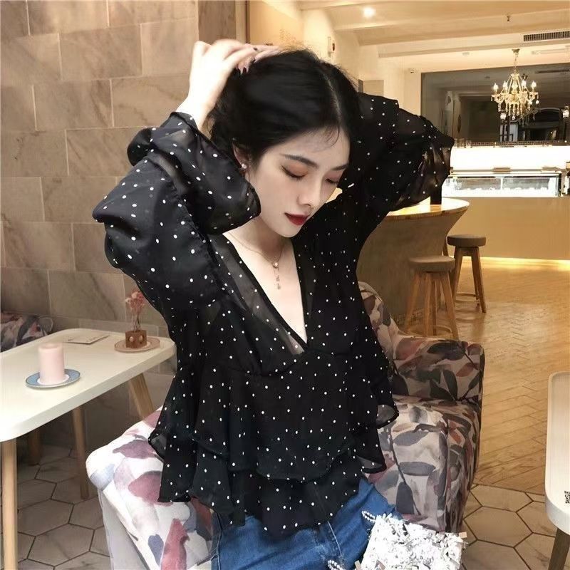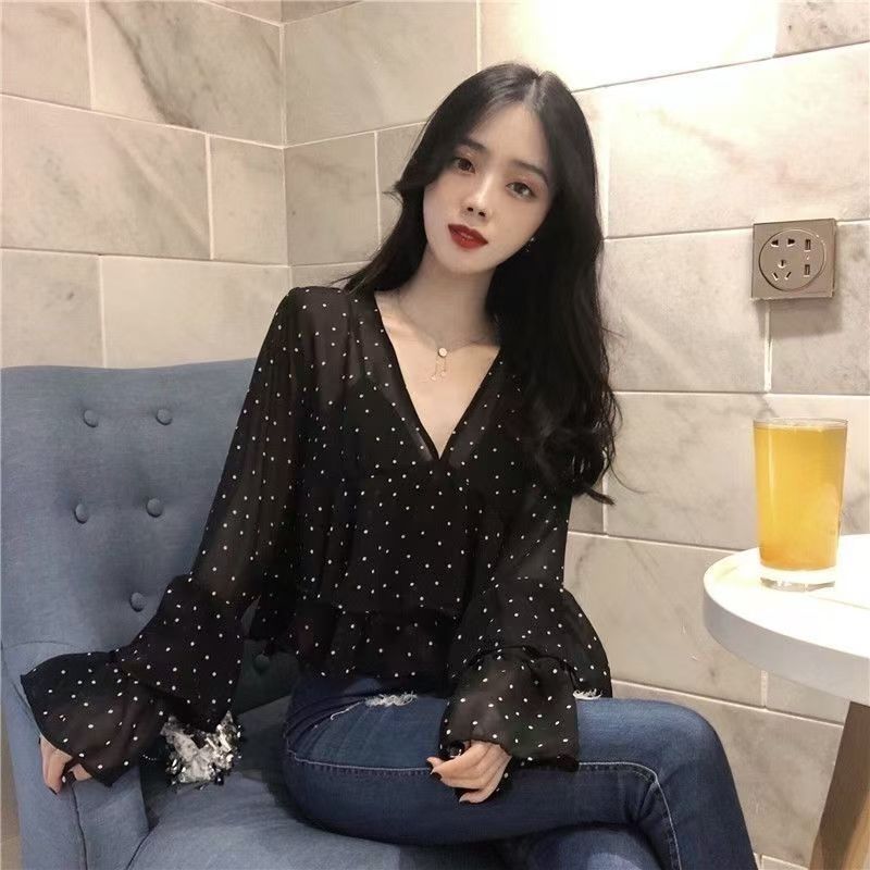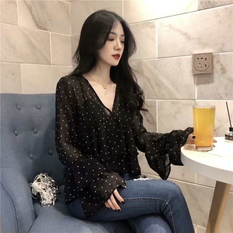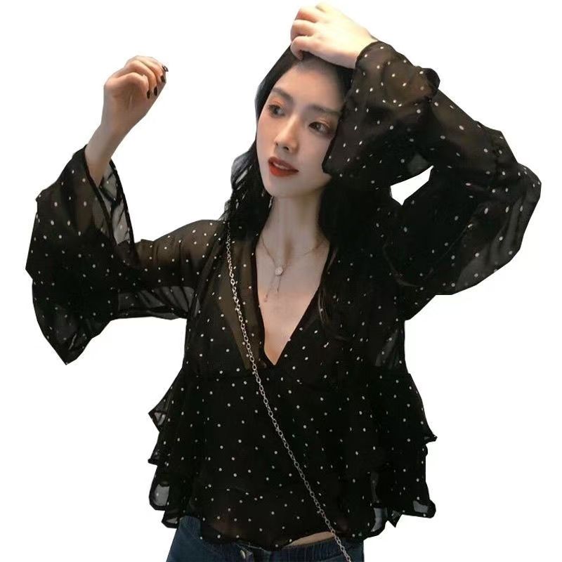 YF5751-图片色甜美时尚春秋长袖V领荷叶边波点大码显瘦雪纺上衣