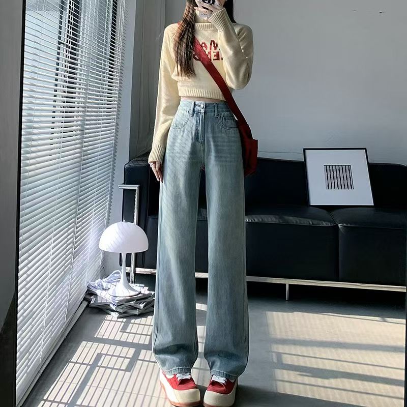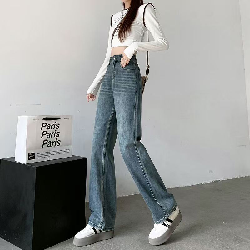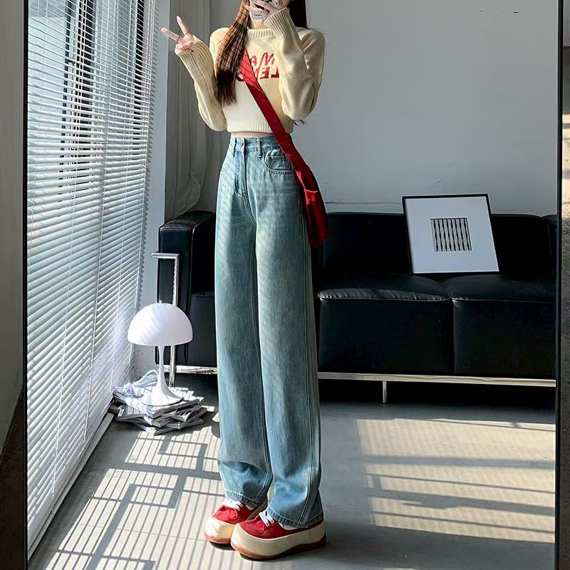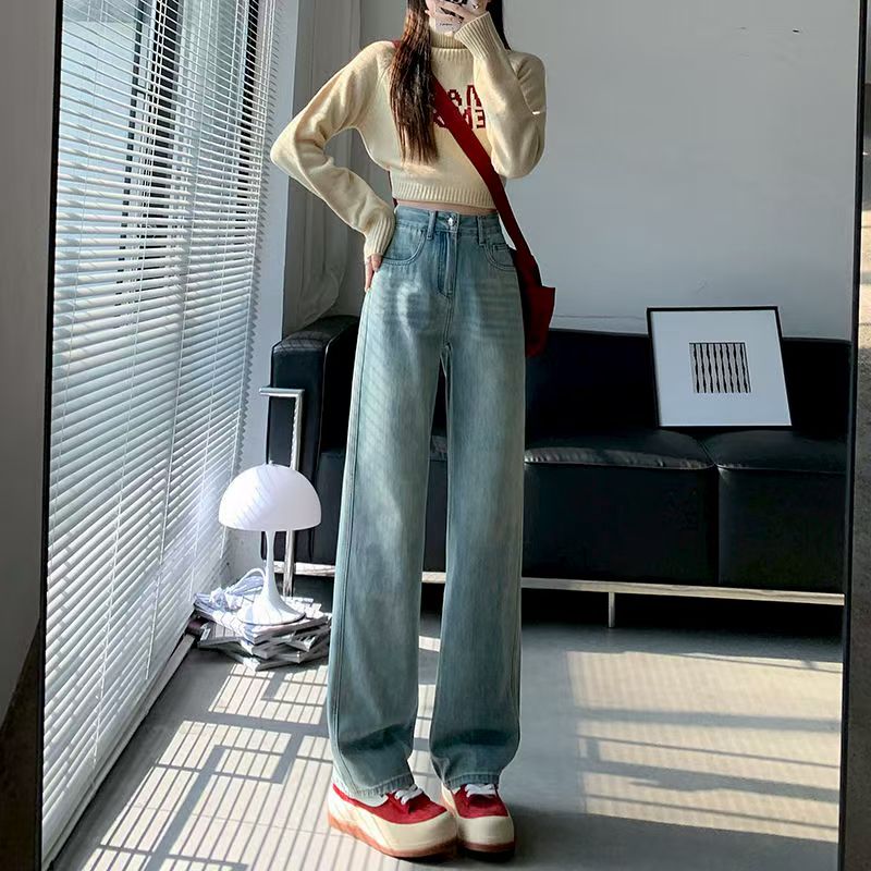 YF5884-图片色2025新款港味高腰系扣直筒条纹做旧春秋百搭简约牛仔裤