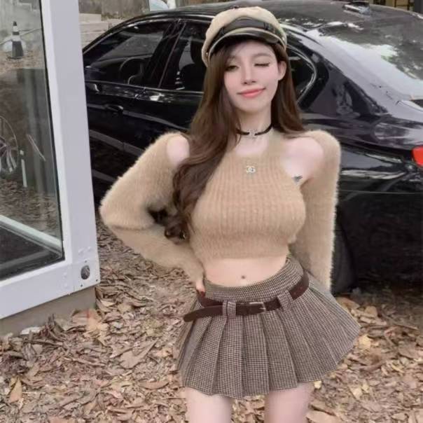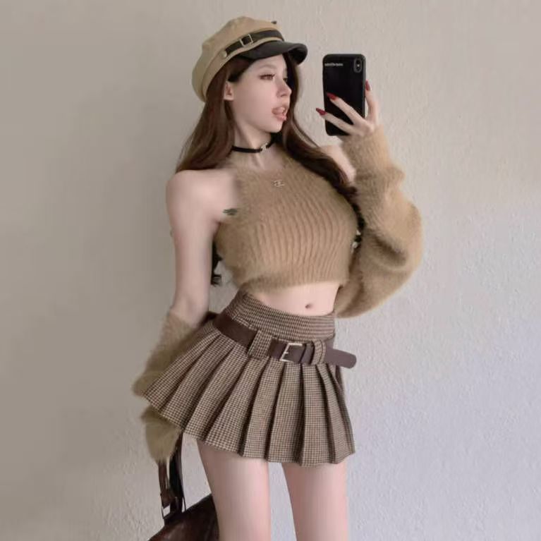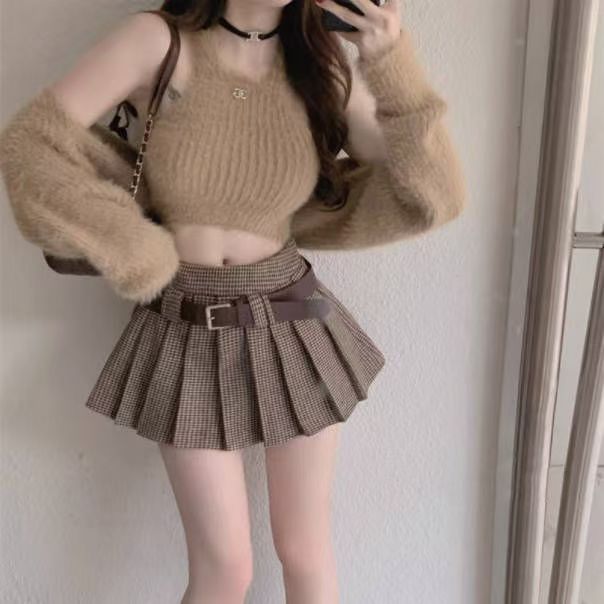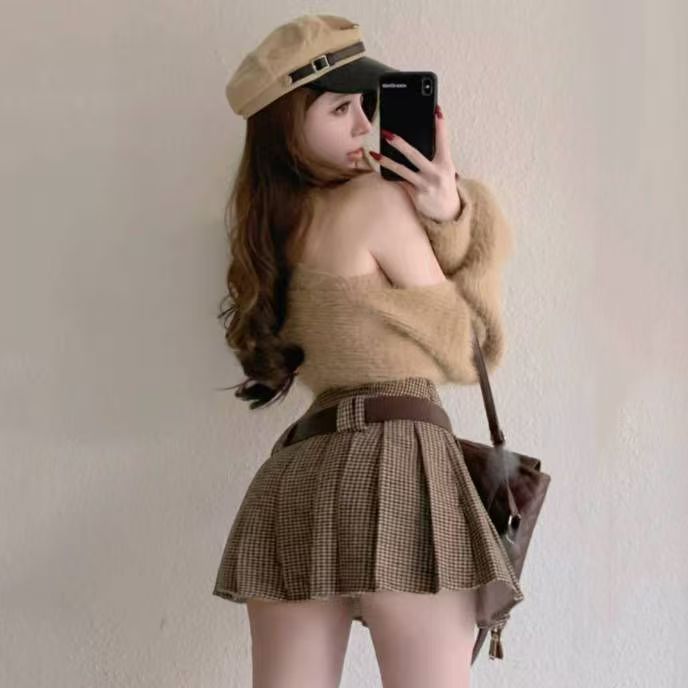 YF5885-图片色秋冬时尚高腰百褶A字学院风JK控复古格子防走光短