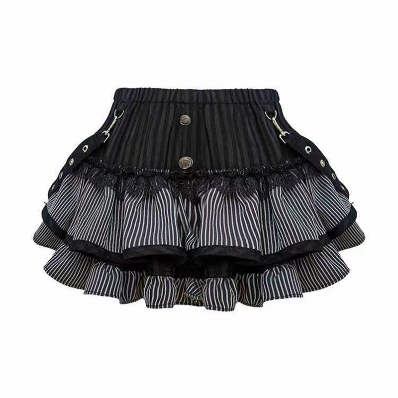 YF5902-图片色精品收腹高腰A字褶折二色拼接排扣条纹蕾丝边设计短