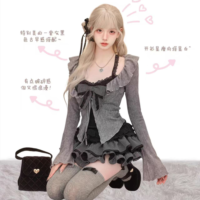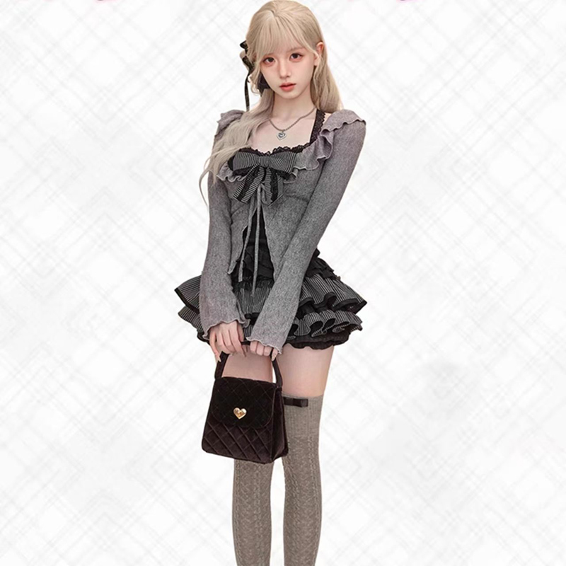 YF6143-图片色两件套冬季加绒长袖连帽熊熊设计系扣上衣花苞褶折短裙套装
