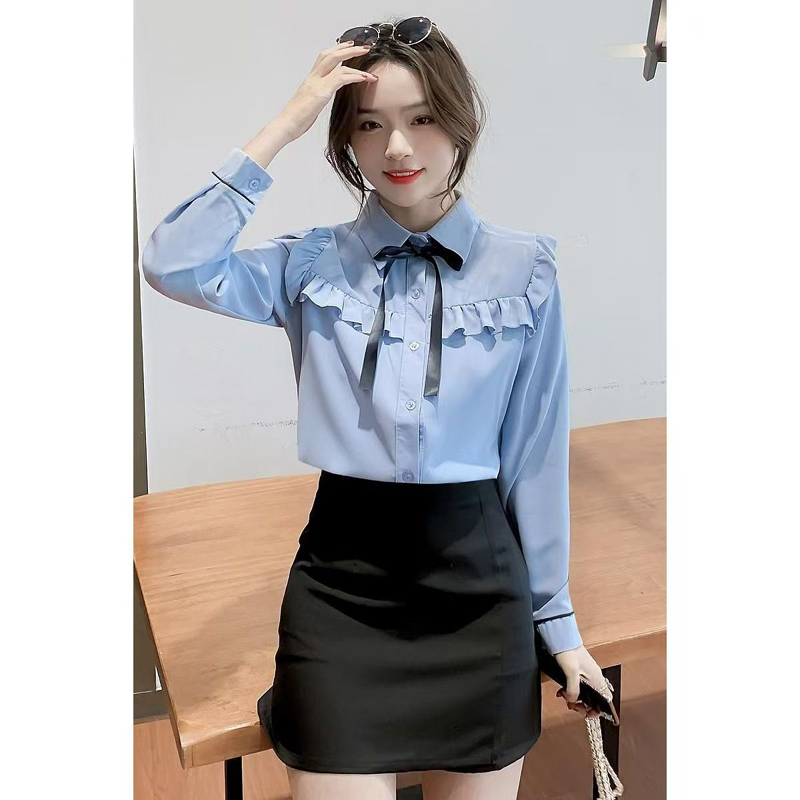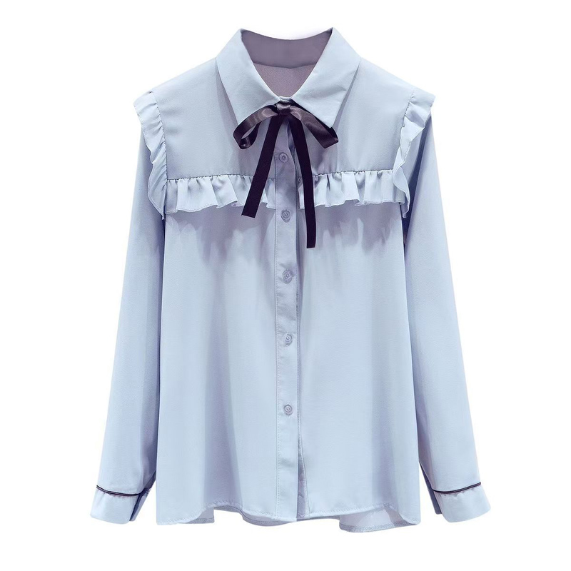 YF5905-图片色OL甜美气质长袖荷叶边系蝴蝶结宽松显瘦通勤雪纺衬衫