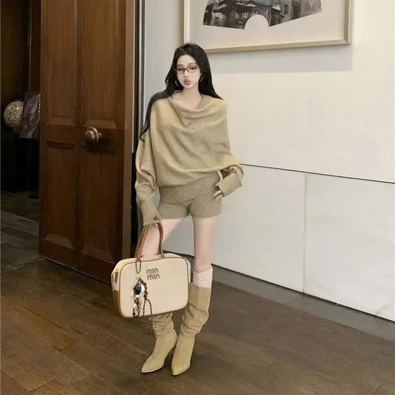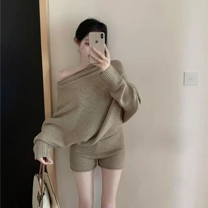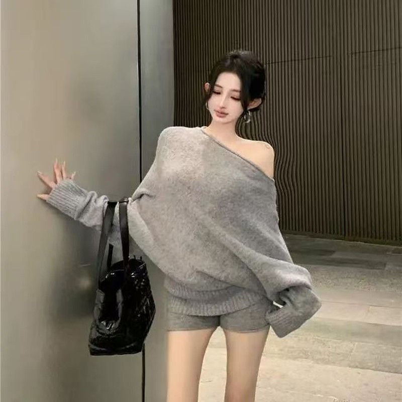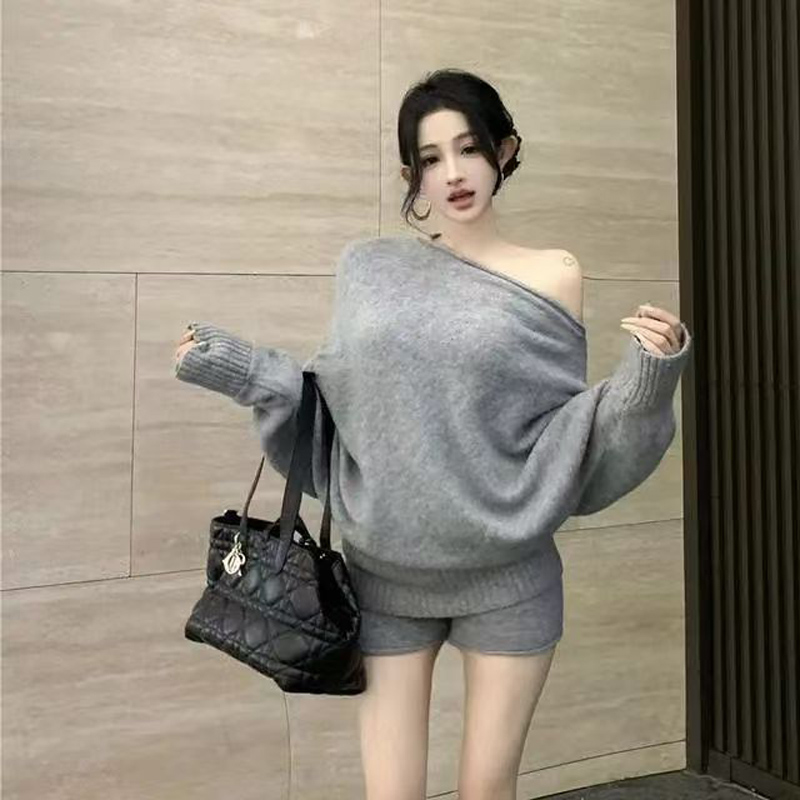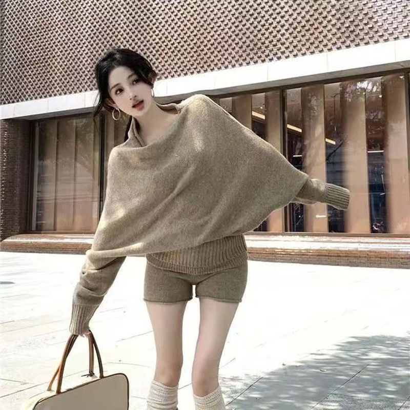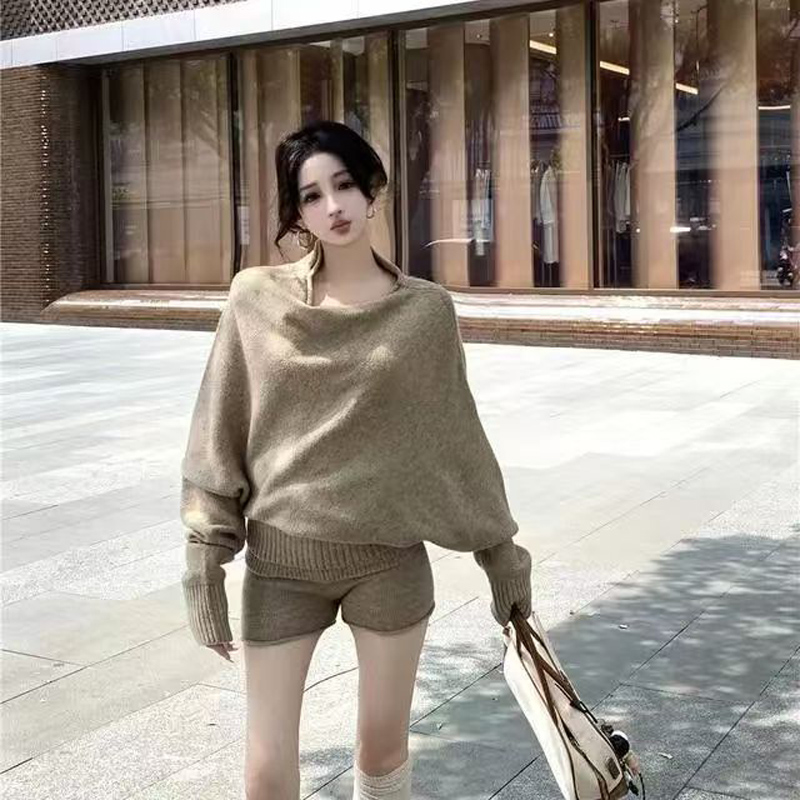 YF5907-(2色入内)性感时尚蝙蝠袖套头两穿露肩宽松显瘦慵懒风休闲针织上衣