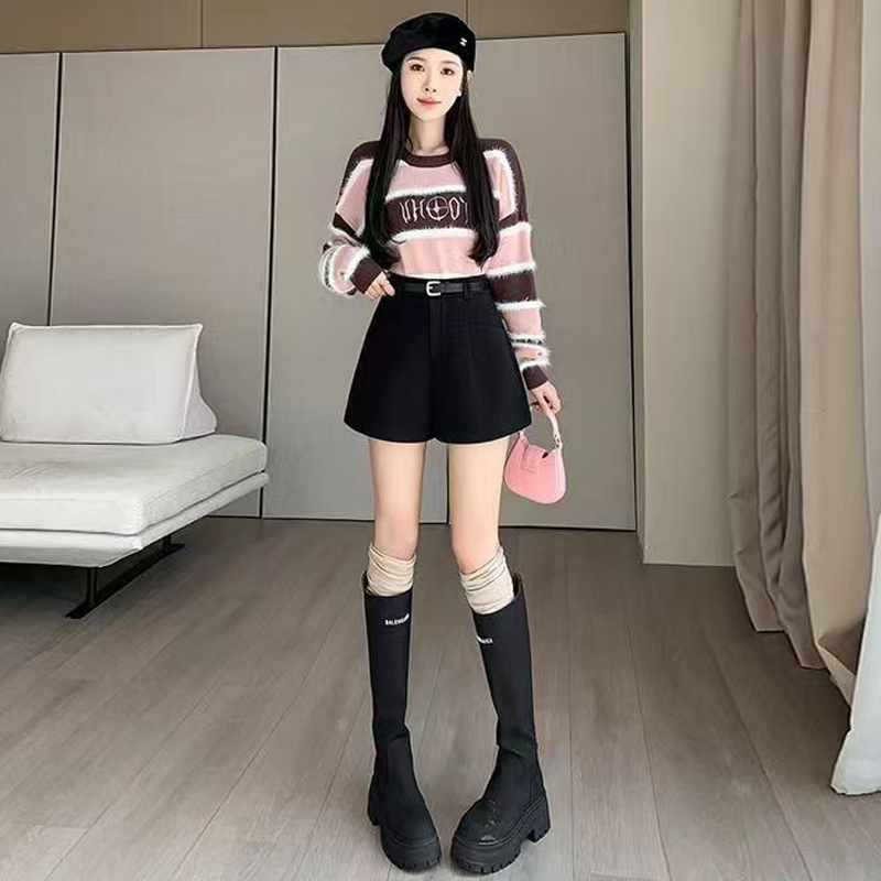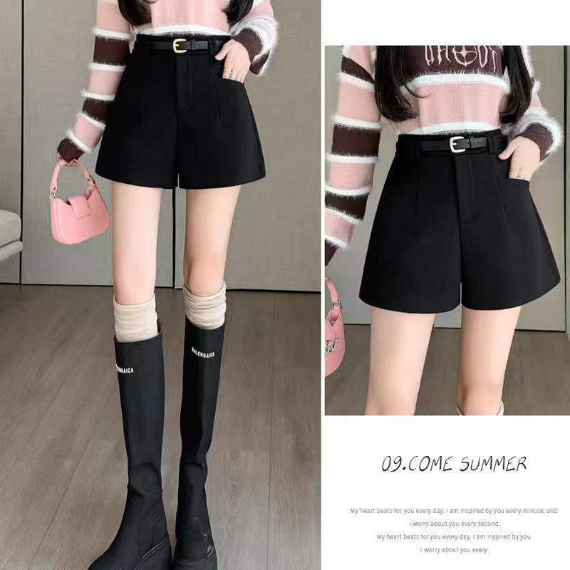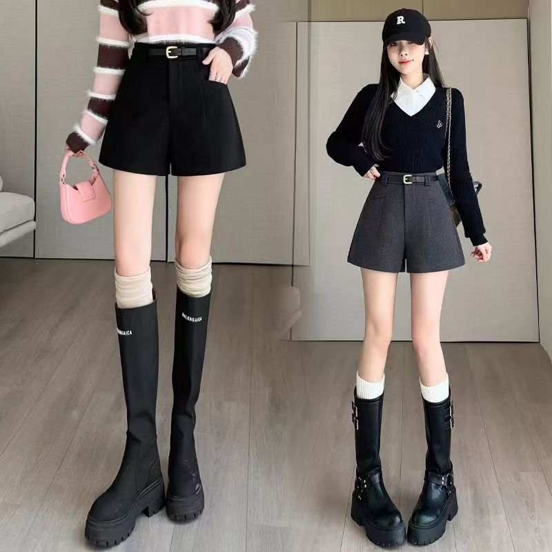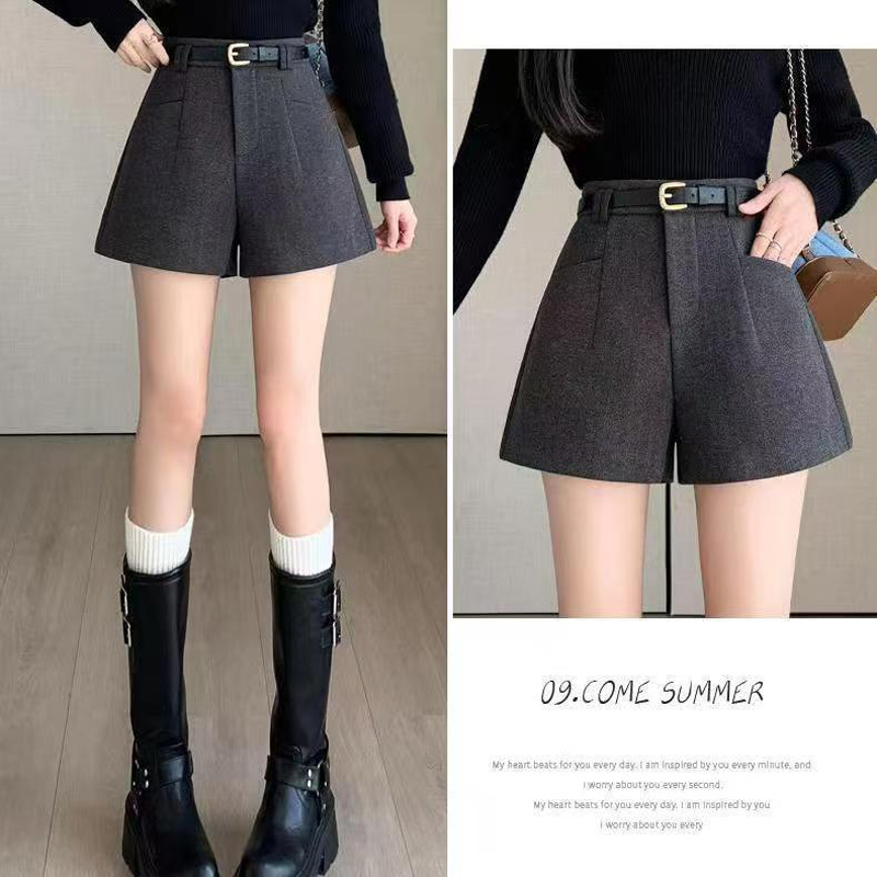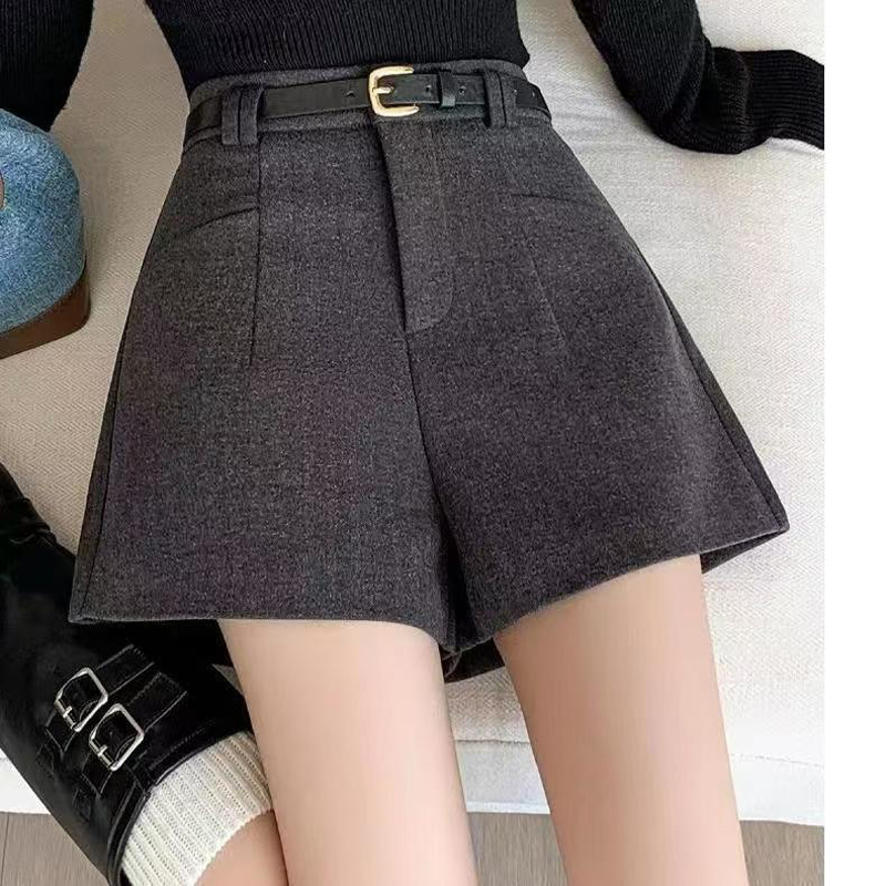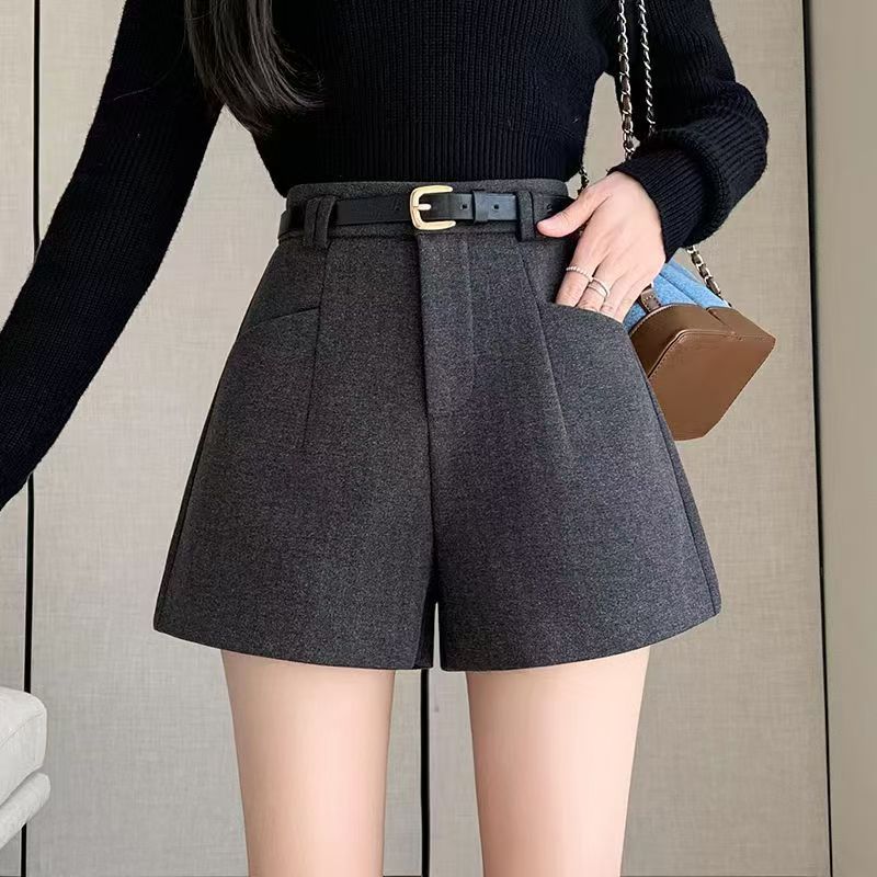 YF5924-(2色入内)秋冬毛呢系扣高腰A字插口袋阔腿纯色百搭休闲短裤
