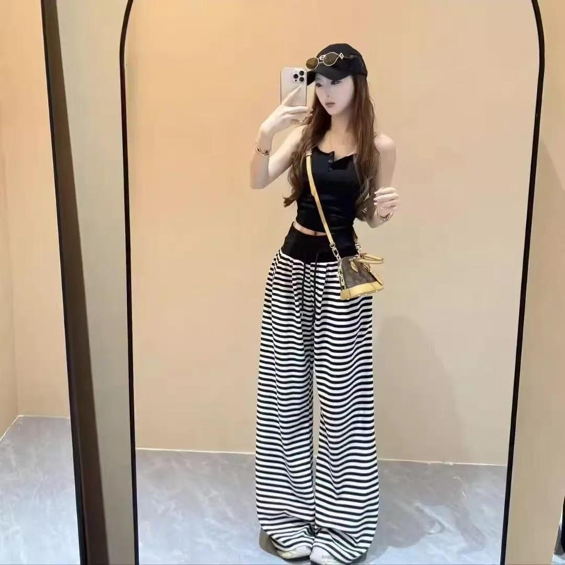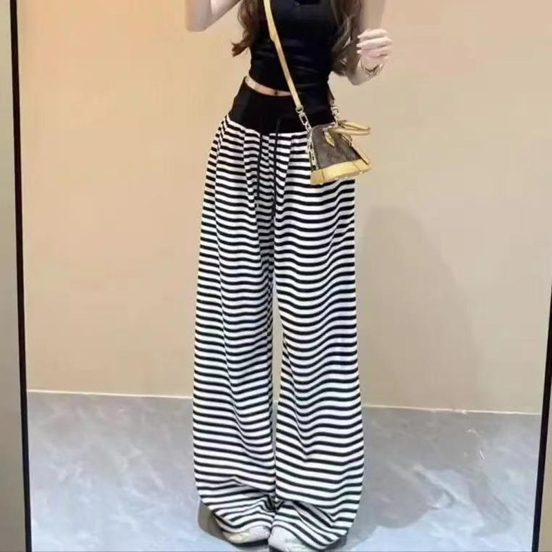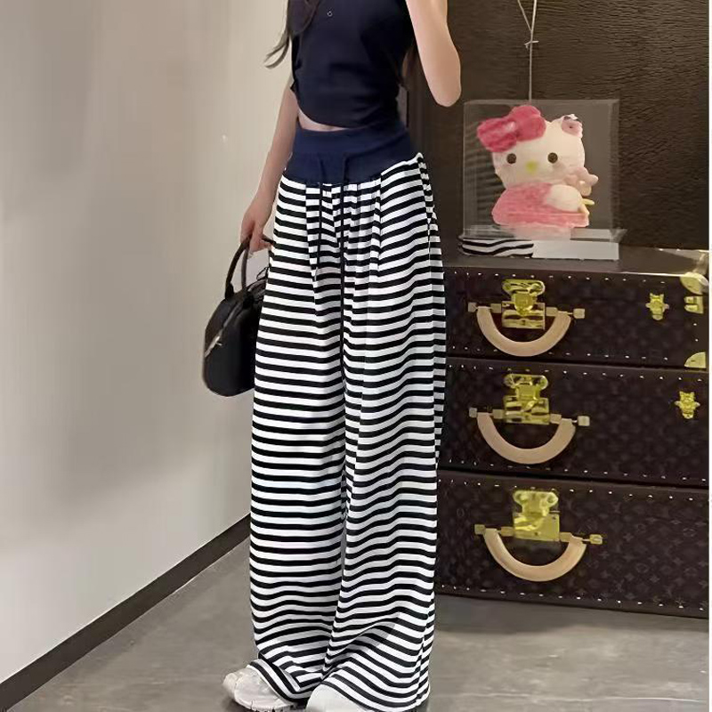 YF5964-图片色条纹黑色拼接直筒坠地感抽绳绑带宽松显瘦运动休闲卫衣裤