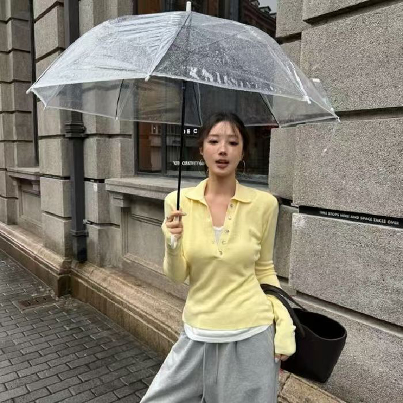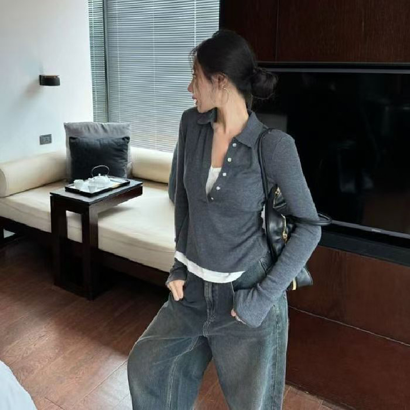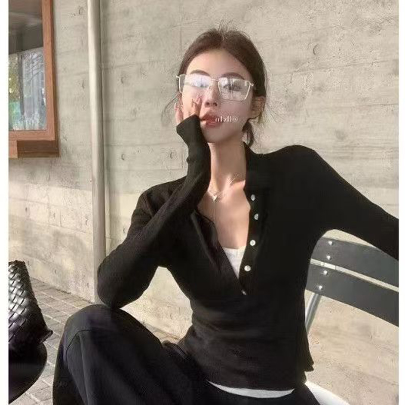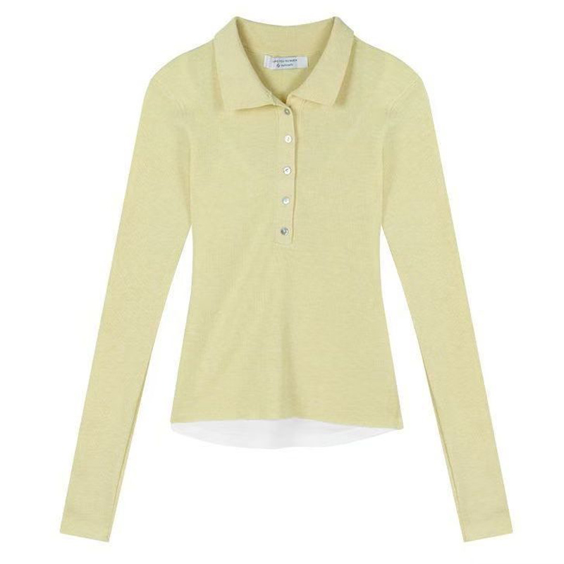 YF5974-(3色入内)秋冬针织保暖长袖POLO领排扣拼接假两件收腰韩版毛衣上衣